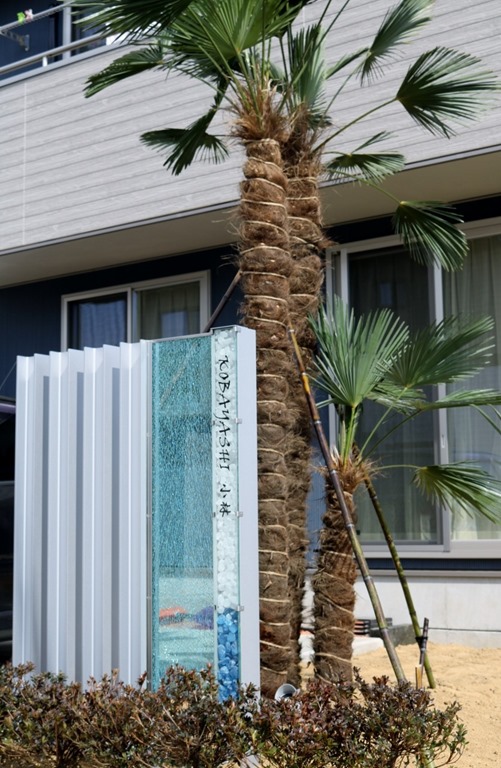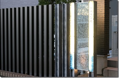 H鋼に合わせ硝子サインを取り付け、H鋼とサインの間にリコストーンのカラーをした現場です。 リコストーンは上部にクリアを下部にカラーのブルー・グリーンを入れた門柱です。
