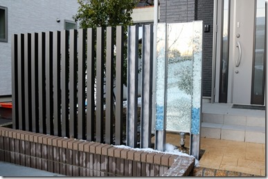 H鋼の門柱が評判がいいので、H鋼をアルミで作ってしまいました。鉄製と違い軽く作業性がいい事と錆が出ないのでいいと思います。塗装を施すと鉄性のものと見分けが付きません。ジュエルグラスはミラータイプでH鋼の柱2本にリコストーンをクリア・ブルーの2色を使いました。