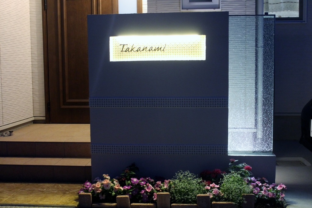 ジュエルグラスとインターホンカバーの尹尚を取り付けた門柱は、アップライトの明かりがジュエルグラスを透過して、夜間も素敵なエクステリアの票所を見せてくれています。