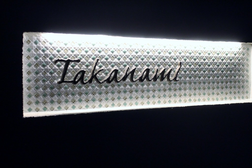 縦に細長いインターホンカバーの尹尚に和文字と欧文字、インターホン子機の下に縦ラインをデザインして、そこから灯りが漏れています。