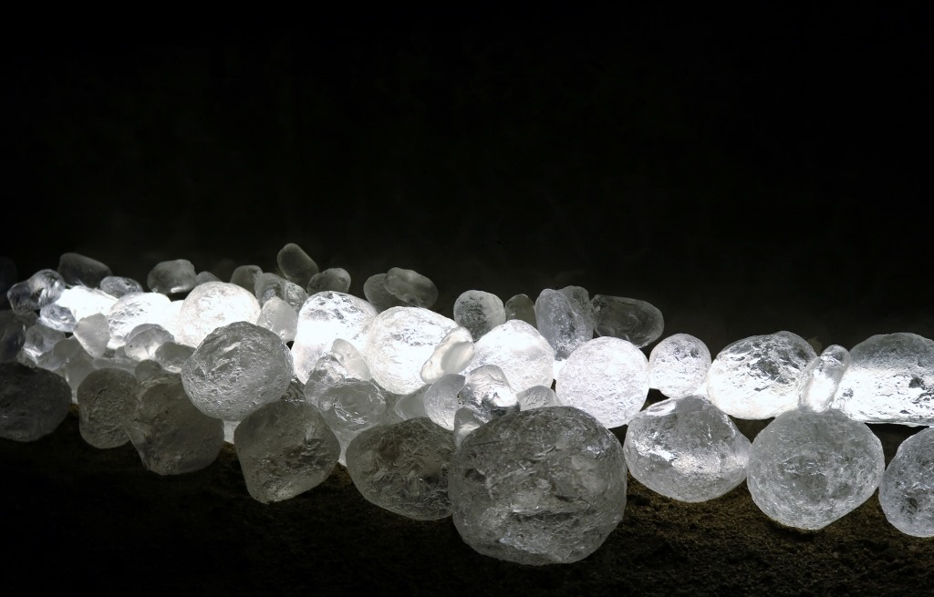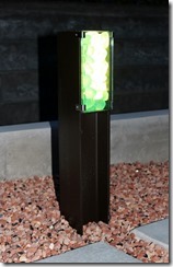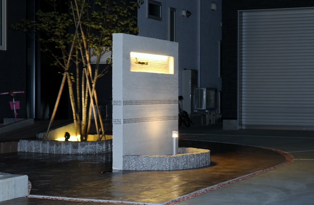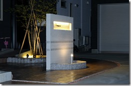 門柱の中ほどの下地ブロックの厚みを変えて積み、片側の側面に特注の長いLEDバーを取り付け、手前に汎用部材を付けて、正面からはLEDバーを見えなくしています。門柱中央の窪んだ縦のラインに灯りが付くと縦ラインが浮き上がるように見えてきます。 間接照明の灯りです。