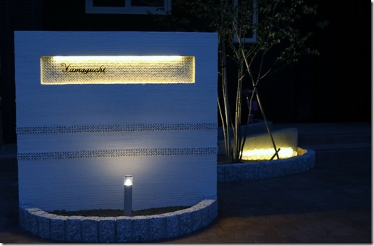 門柱の横に、同じ高さにして、アルミのポールを立て後ろ側にシンボルツリーを植え下からライトアップしています。 照明の灯りは壁があると綺麗に見えてきます。