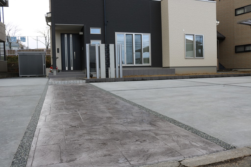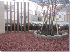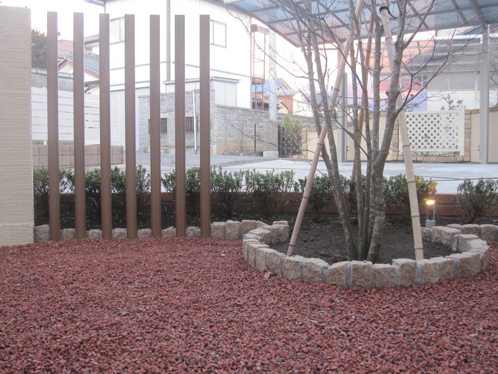 こちらのお宅は駐車スペースをを広げつつ、左から植栽帯の荒倉ゴロタ、アプローチには火山岩のラバーズロック、土留めには浅間石。と既存お庭の雰囲気を壊さないよう天然石でまとめたリフォーム外構です。