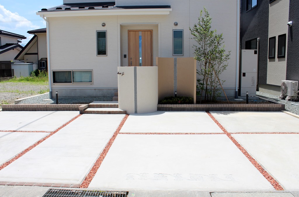 アプローチも兼ねて駐車スペースを広く確保し、元々のお庭の雰囲気を壊してしまわないように荒倉ゴロタや浅間石等、全体を天然石でまとめたリフォーム外構に仕上がりました。