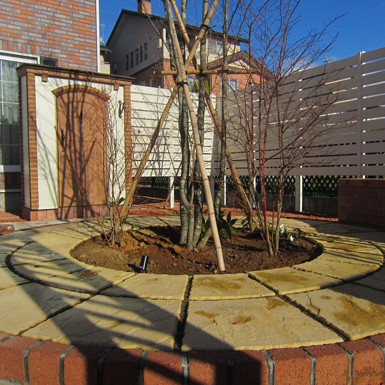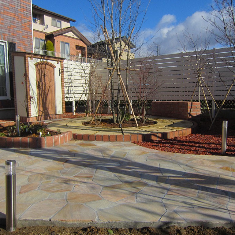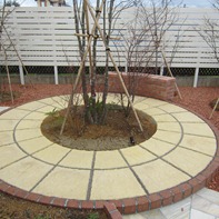 樹脂板を施工したことで庭にある植木・石畳・レンガベンチ・サークルのすべてのものの存在感が感じられます。