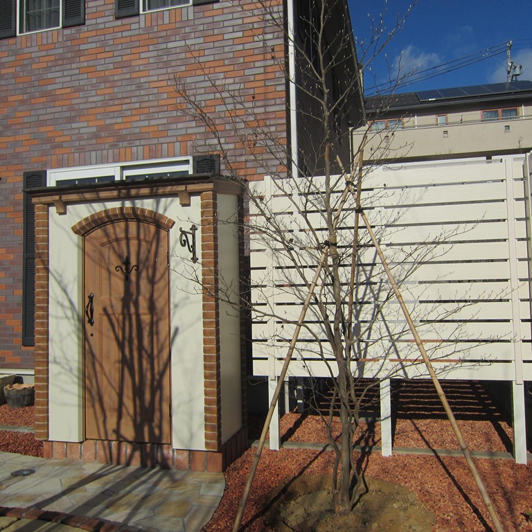 仕様内容 ●門柱 ジョリパツト塗仕上げ 洋風瓦セレトルク Rフィックスフェンス3型 ディーズ鋳物サインA-07 ミニオーナメントH ポスト・ノーブルF 表札灯リーフ アルミ鋳物門扉レンヌ ●アプローチ 天然石貼りイエロー 立ち上がりレンガ立て ●塀 ジョリパット塗仕上げ ウルトラC積 マイティーウッド チークブラウン ●駐車場 ソルデイーポート54-57 目地樹脂舗装大和桜 スタンプコンクリートアシュラ ●テラス ココマオープンタイプテラス2間×8尺クリエラスク+アイボリーホワイト内部日除けホワイト 床300角タイル貼り ●植栽 ヤマボウシ株立・シャラ株立・ジュンベリー株立・シャラ株立・ソヨゴ株立 ●建物回り 防草シートテコラ敷きこみ