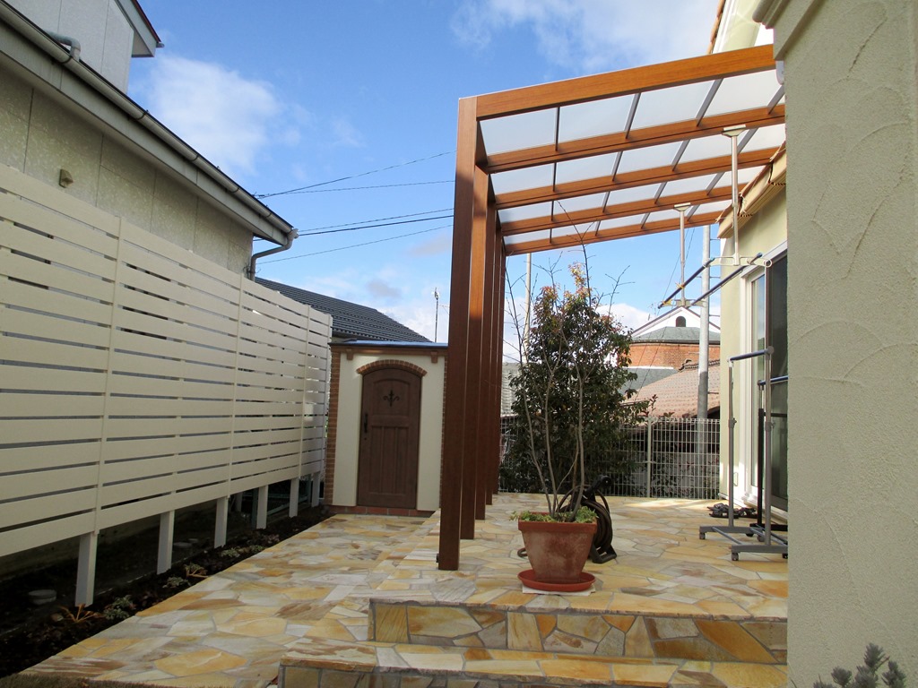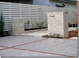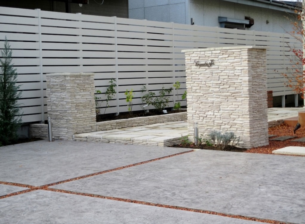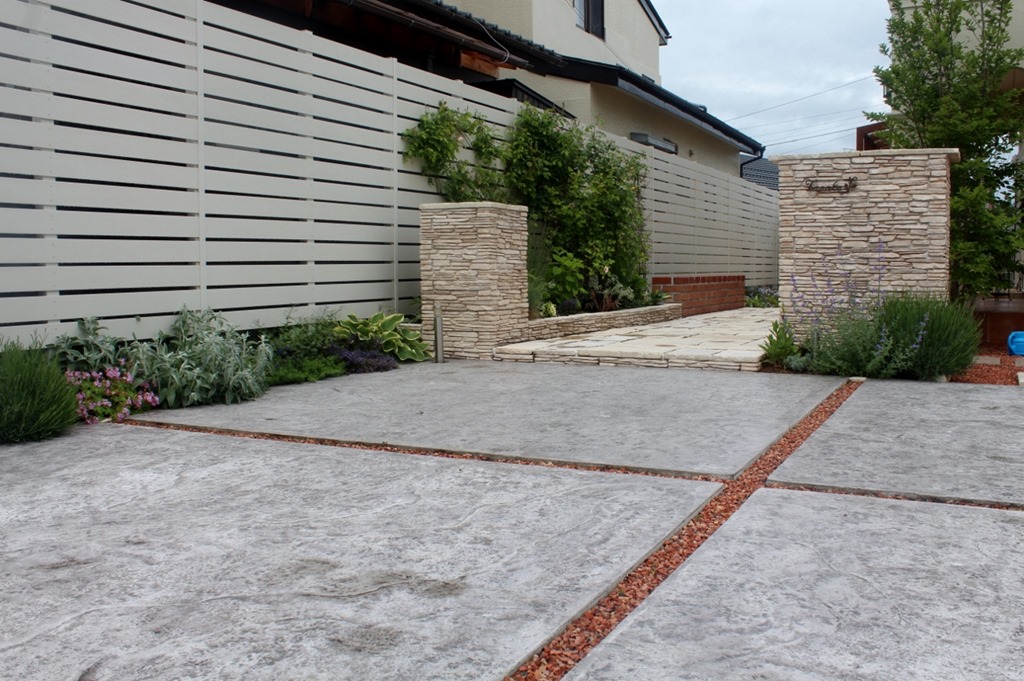 仕様内容 ●門柱 アルミH鋼+ジュエルグラス ●アプローチ スタンプコンクリート ●駐車場 ソルデイーポート54-50H23 ●塀 樹脂フェンス マイティーウッド