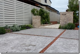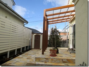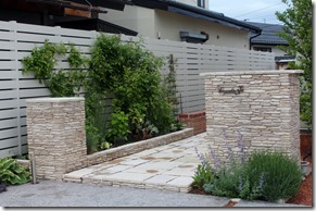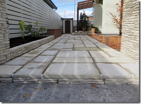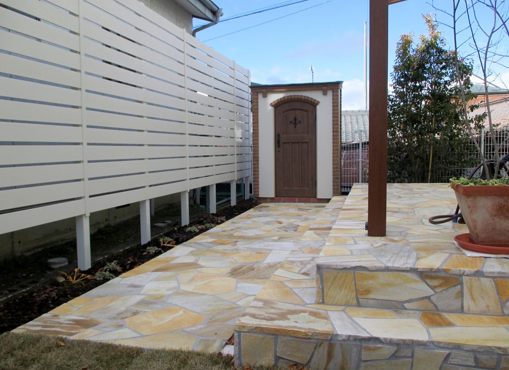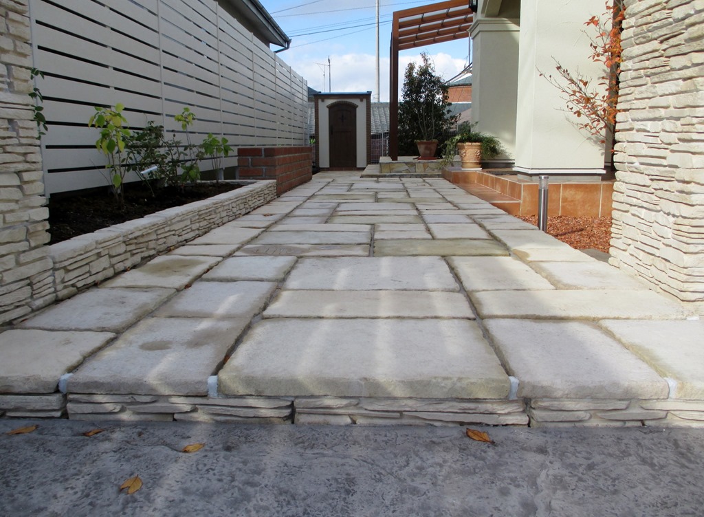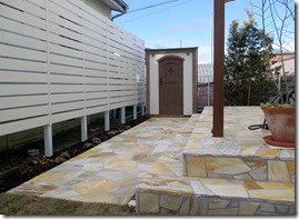 英国製の擬石ブラッドストーンの通路、奥に施工された天然石張りのテラスも使い勝手が良くなったと思います。