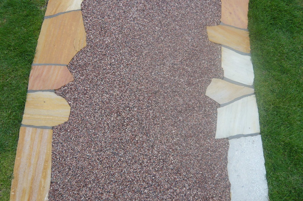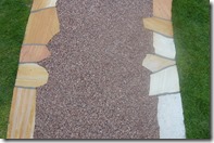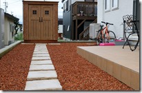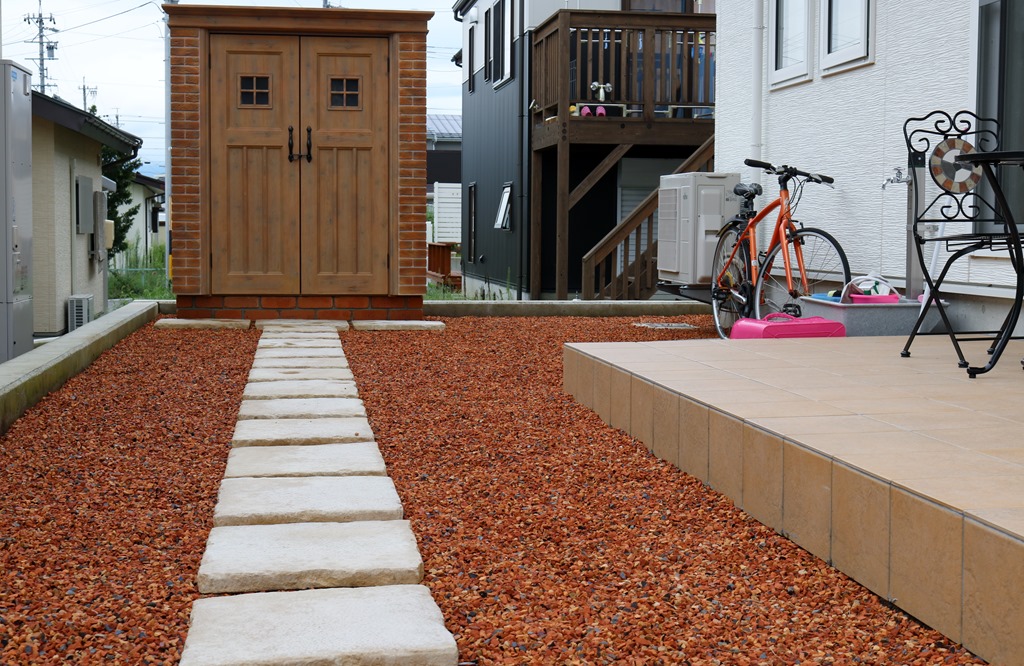 ●庭 防草シートテコラ敷きこみ ブラッドストーン飛び石 カンナ物置D-70オレンジ