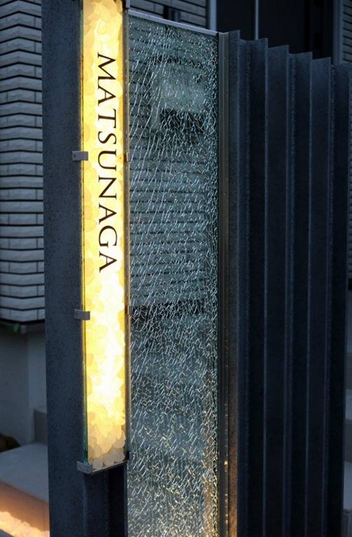 6ミリの厚みのフロート硝子を2枚合わせて、中に和紙を挟みこみ、名前の部分と下側の部分の和紙を変えて作るサイズがW300×H1.000×D12ミリのガラスパネルをビスで門柱の壁に取り付けます。合わせガラスの中に中間膜を入れることで、紫外線を99%カットしてしまい外に取り付けても和紙はほとんど変色することがありません。和紙にもいろんな種類と色があるので、パターンもかなりの数になると思います。