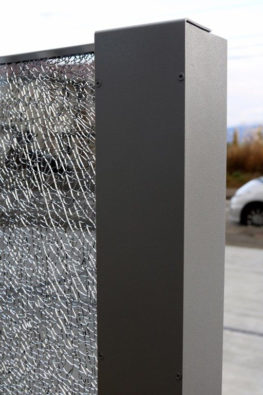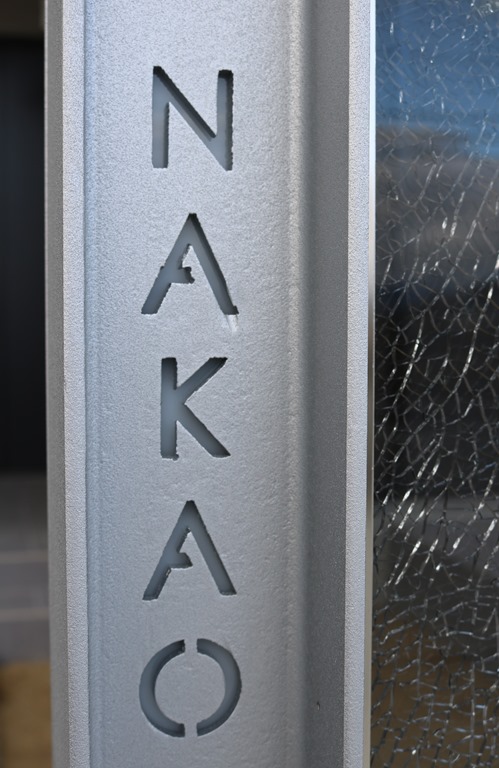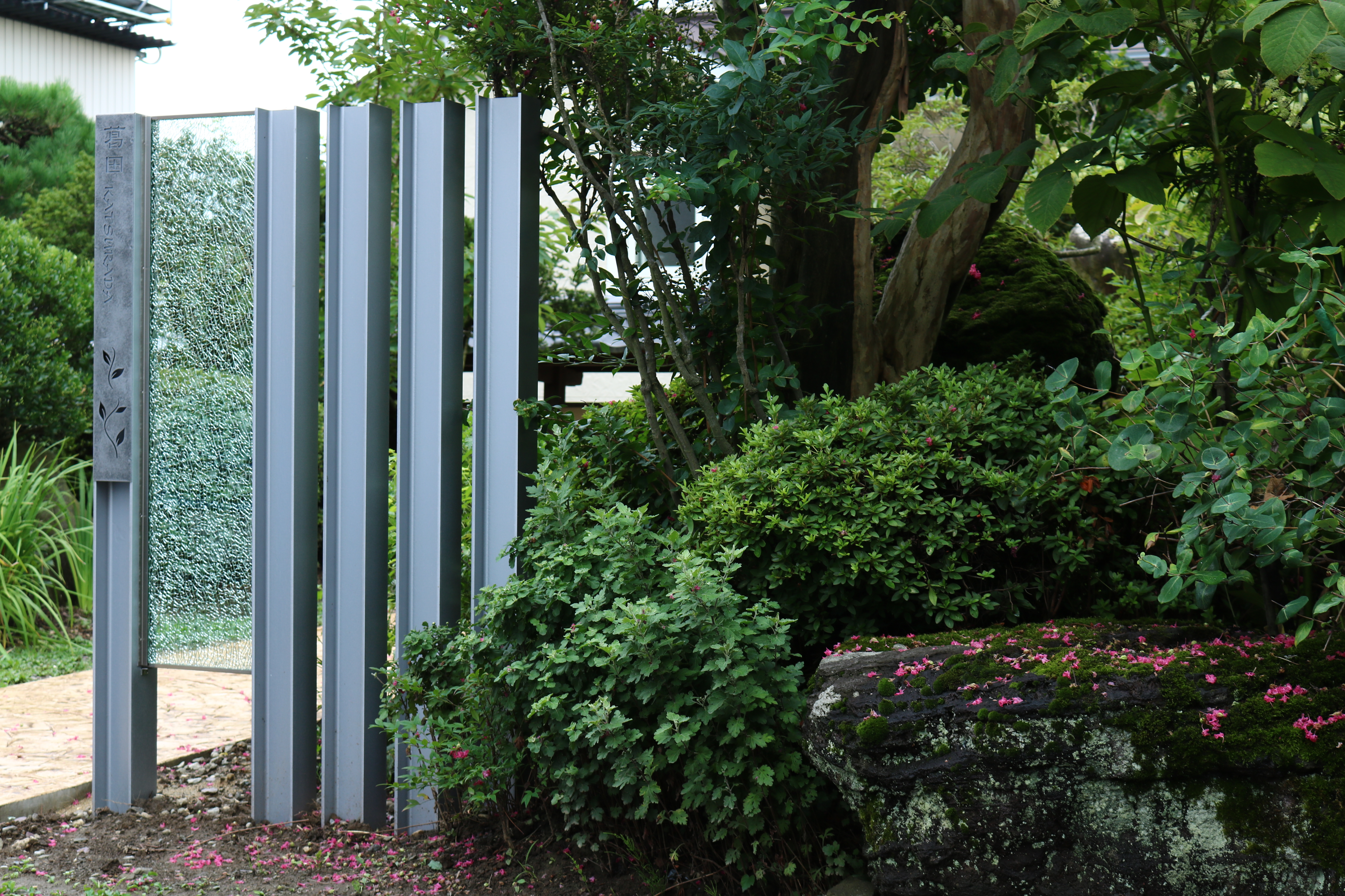 2本のH鋼で人気のジュエルグラスを挟みこみ、左端に錆銀で特殊塗装した伊尚サインを取り付けました。名前の下には、葉っぱのデザインも入れています。 門柱の幅を広く見せる為に、同じ高さでさらに3本のH鋼を立てました。今回はサテンシルバーで特殊塗装したH鋼を使用しています。