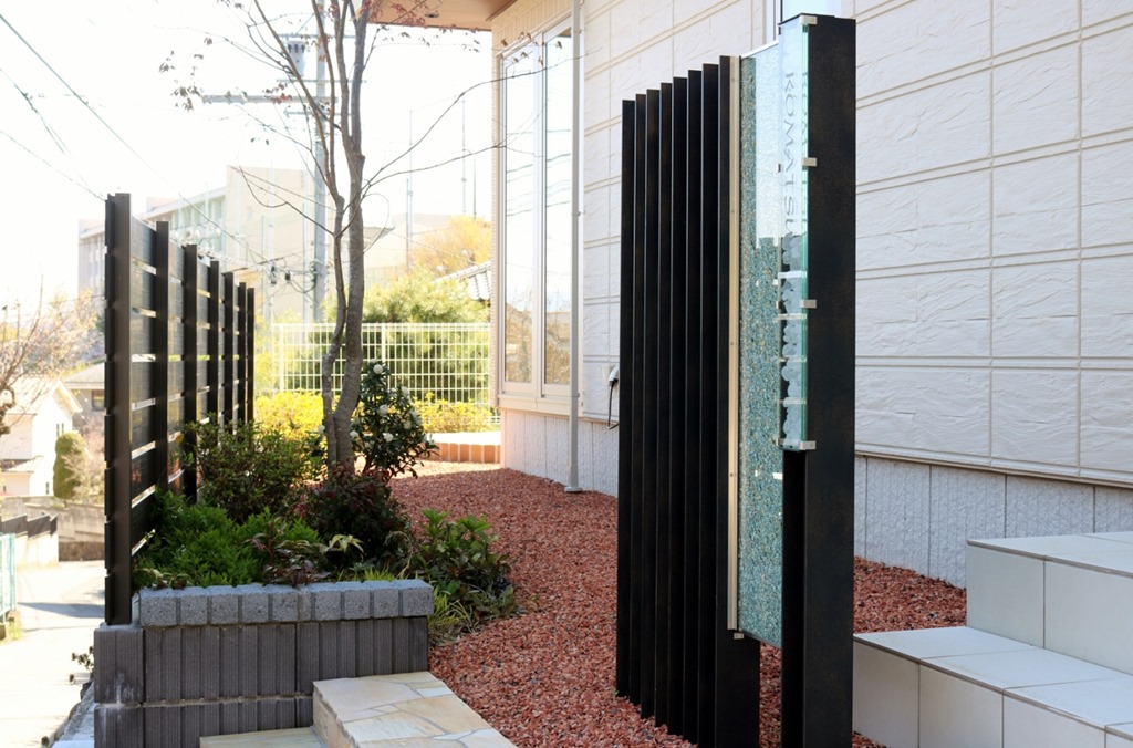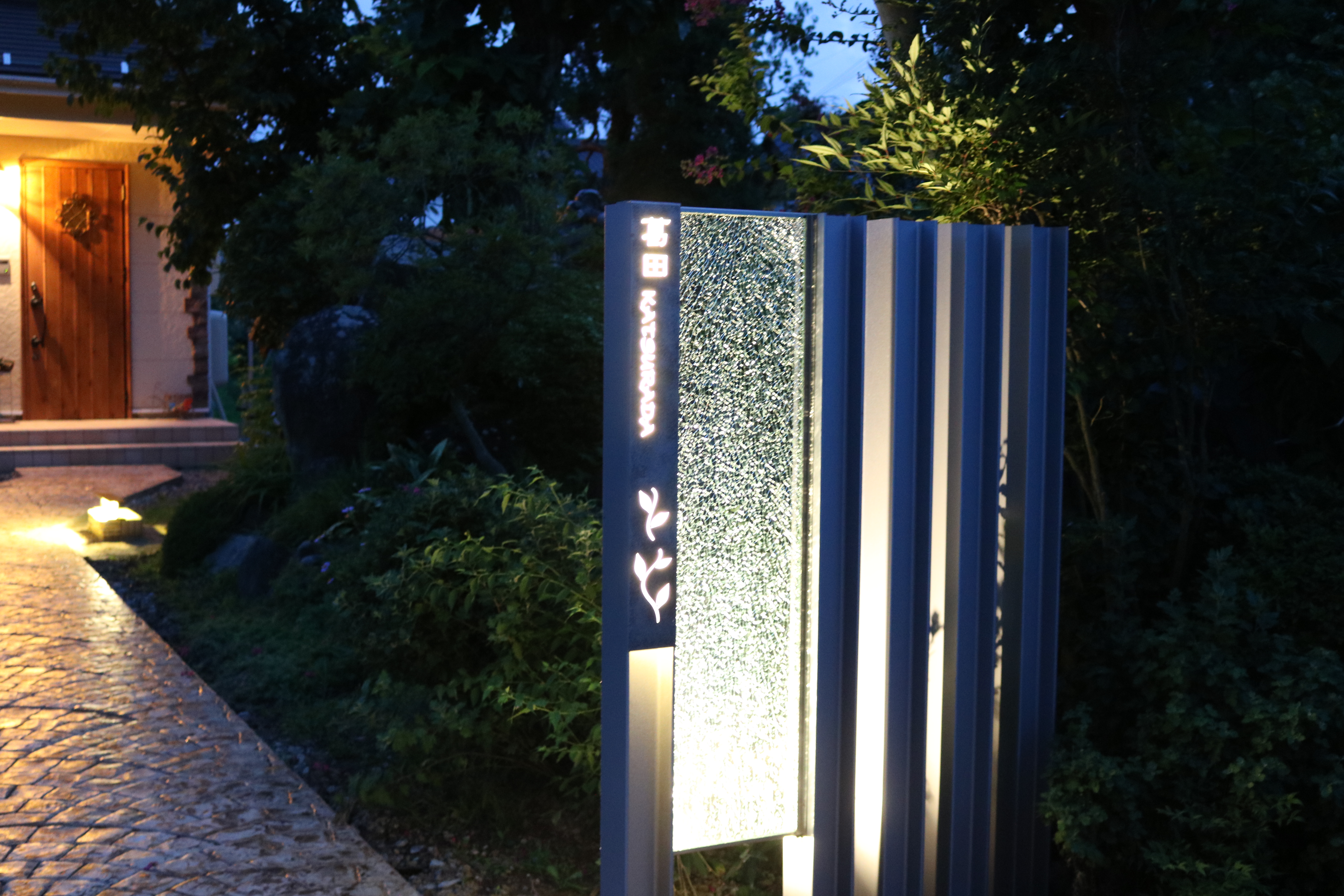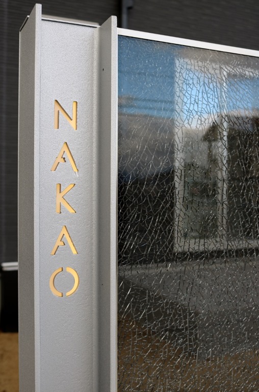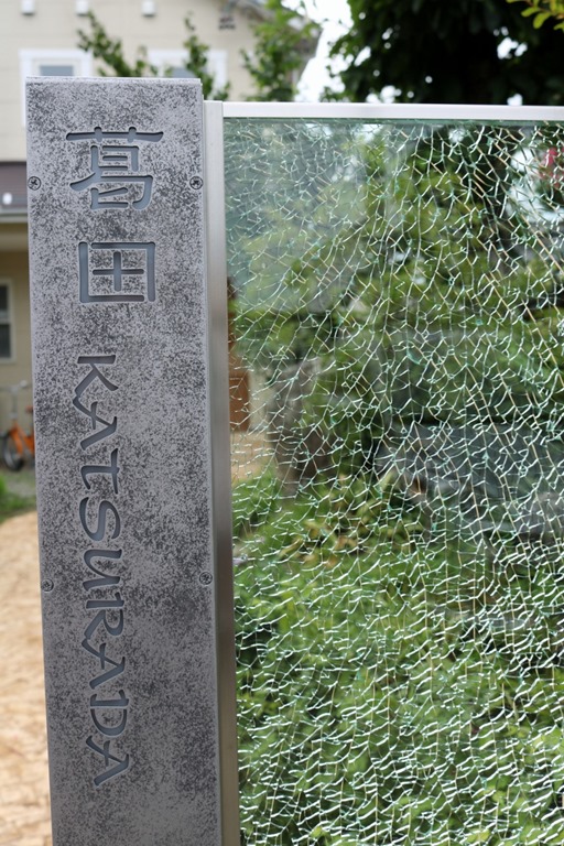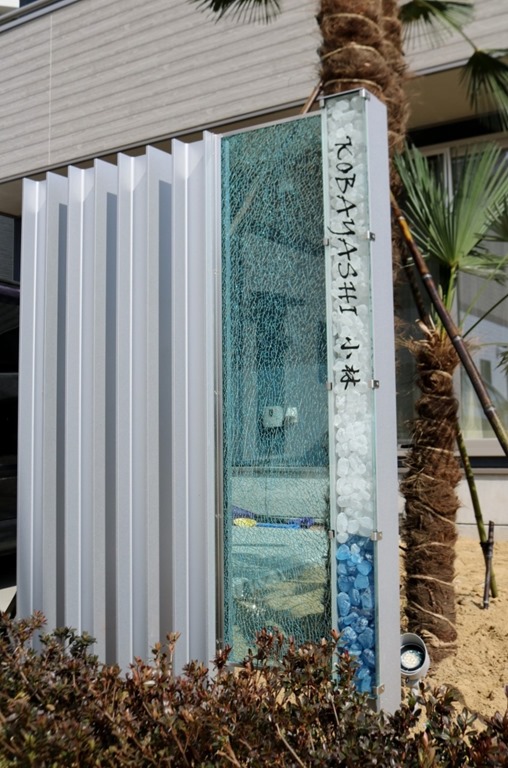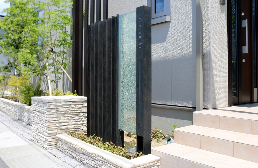 プレミアム門柱に取り付けたサインは、当社オリジナルの合わせ硝子サインです。二枚合わせのガラスにサンドブラストで名前を付けました。中にリコストーンクリア・グリーンを入れています。