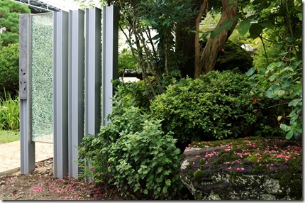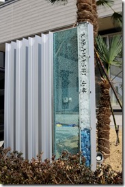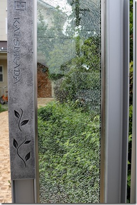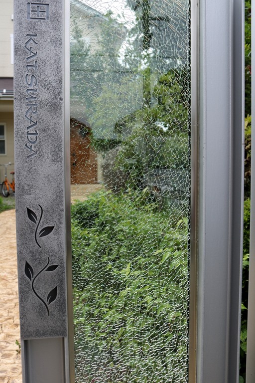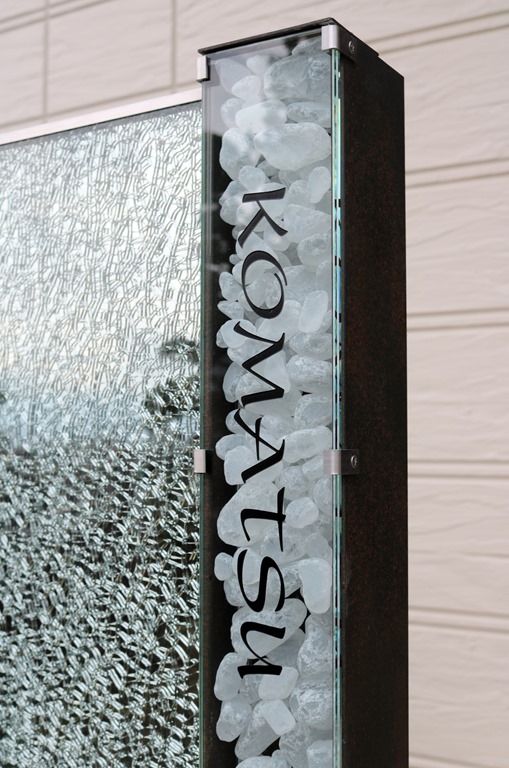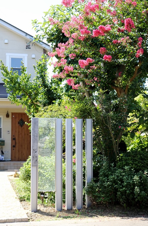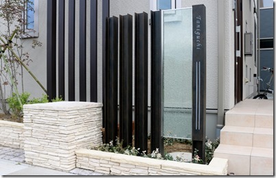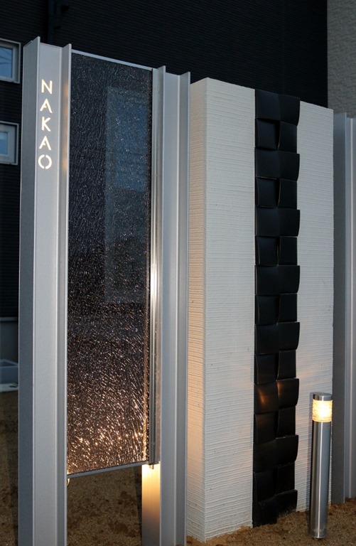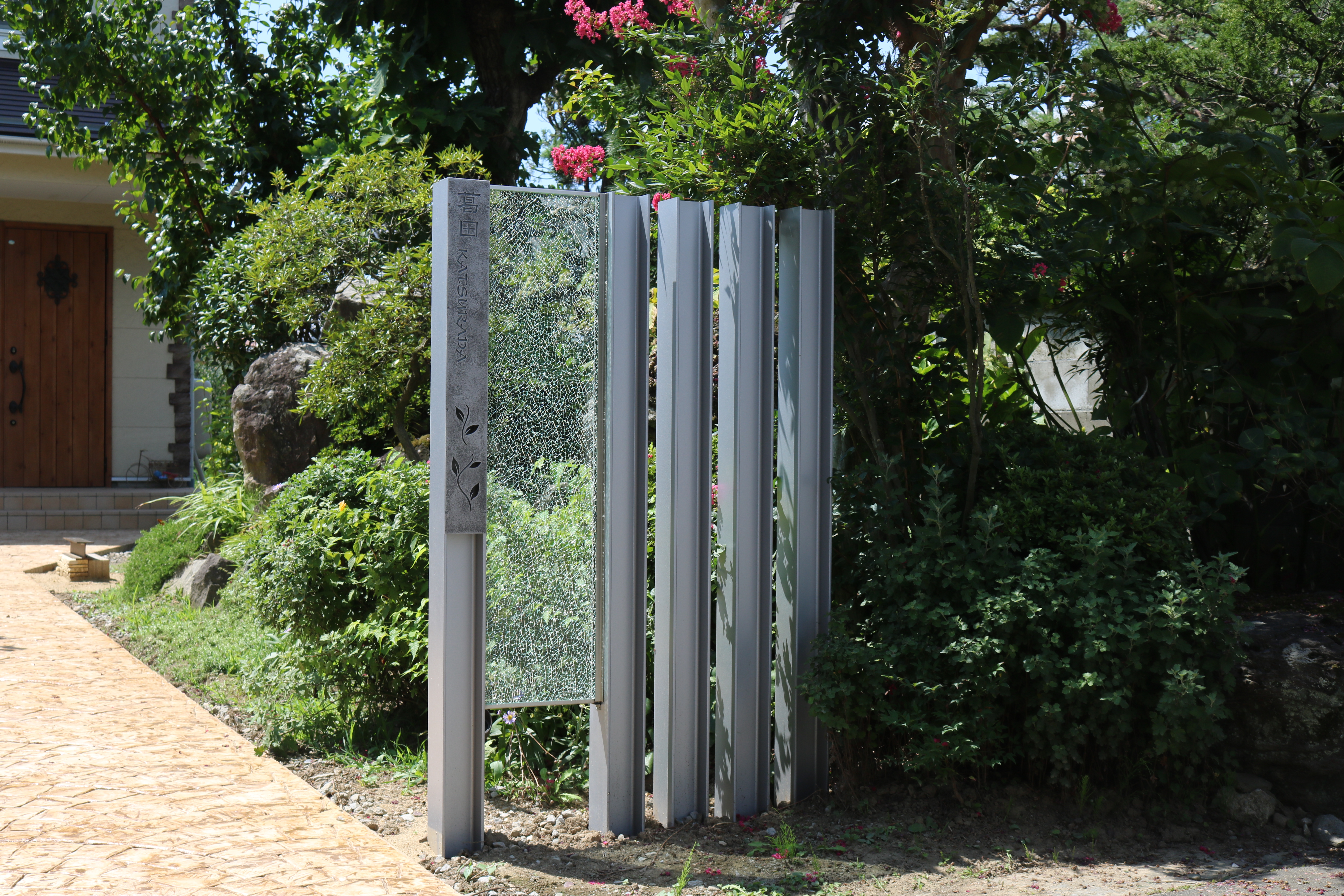 プレミアム門柱に取り付けたサインは、当社オリジナルの合わせ硝子サインです。二枚合わせのガラスにサンドブラストで名前を付けました。中にリコストーンクリア・グリーンを入れています。