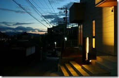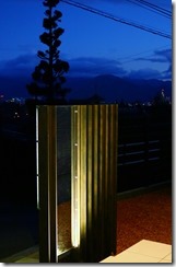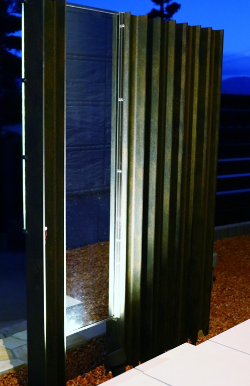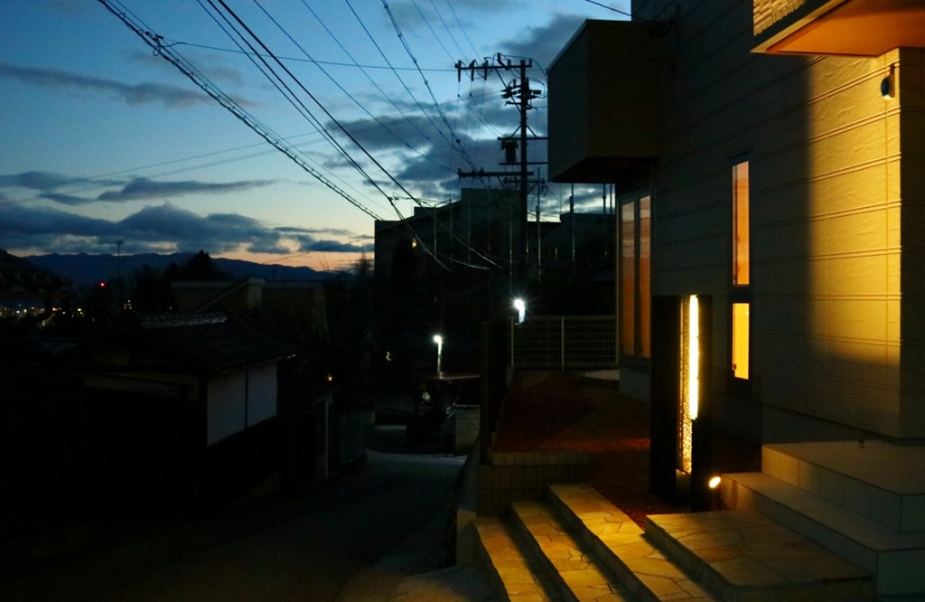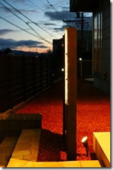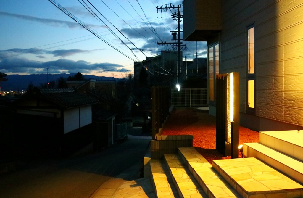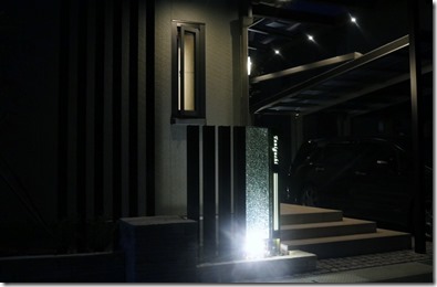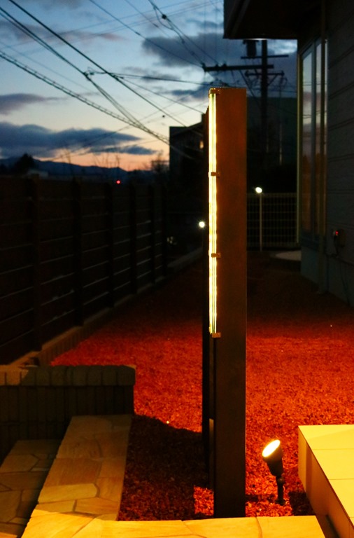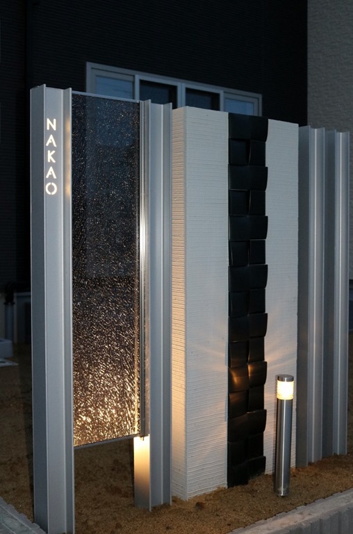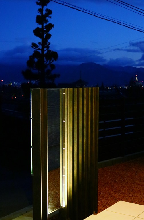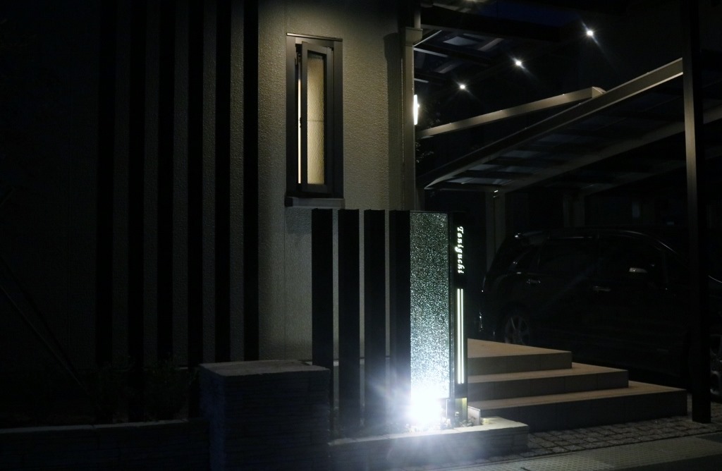 暗くなると建物の壁に取り付けたDCトランスの働きで、設置したアップライトが点灯し、うしろからジュエルグラスを照らします。 同時に伊尚サインの裏に取り付けたLEDテープも点灯し、レイザーでくり抜かれたところから灯りがもれ、文字やデザインがくっきり見れるようになります。 当社が考え作ったオリジナル門柱です。