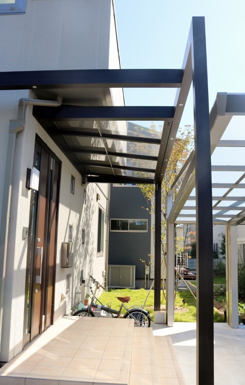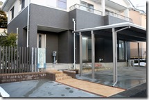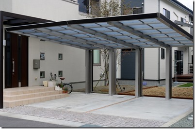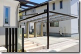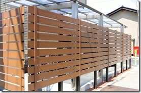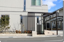 駐車スペースにアルミカーホートを建て、道路側の境界にはアルミ70角の柱を立て樹脂板のマティーウッドを目隠しにしました、隣地境界側は化粧ブロツクにマイティウッドを取り付けています。