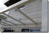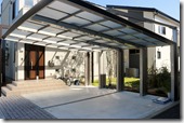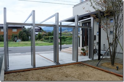 駐車場に3台分の積雪用カーポートを立て、ジュエルグラス・ミラーをアルミH鋼に取り付けて、横にアルミポールを10本以上デザインした外構の現場です。