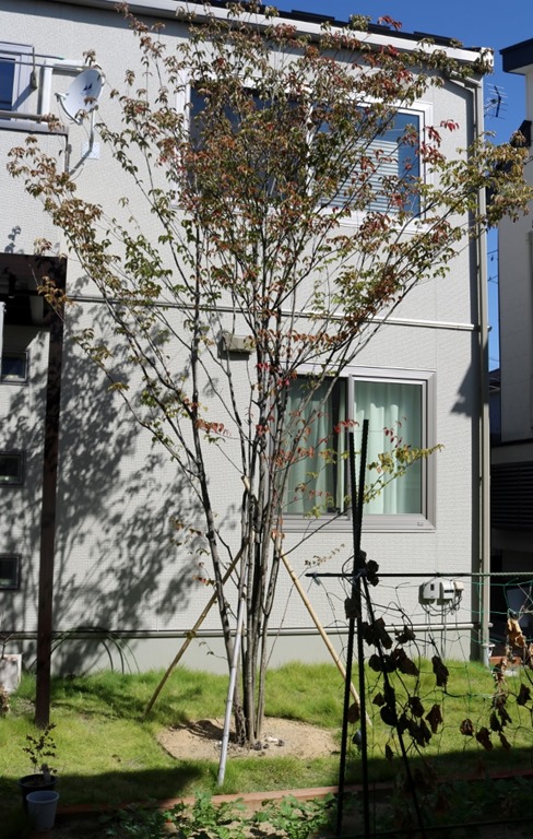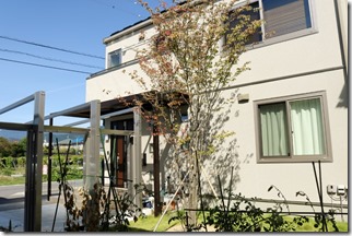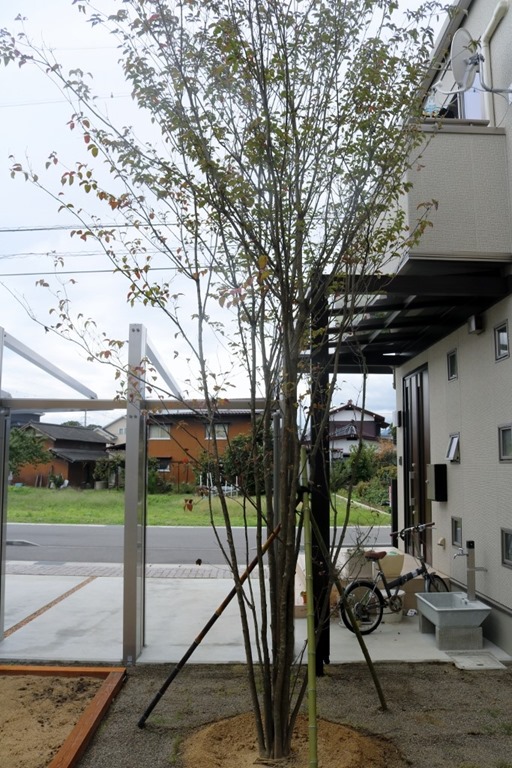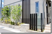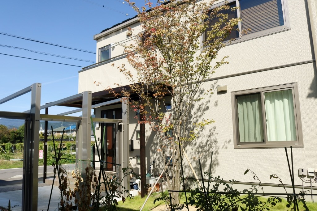 エクステリアは、植栽があるか無では見え方が変わります。門柱横の花壇スペースにソヨゴ・トネリコを植えています。低木でドウダンツツジとボツクスウッドを植えて門柱前にはハツユキカヅラを植えました。 カーポートの後ろ側の庭に背の高いシンボルツリーでヤマボウシの株立を植えています。庭は畑にした部分以外は高麗芝を貼りました。植栽がある現場は素敵に見えます。