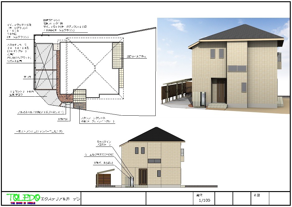 仕様内容 ●門柱 アルミH鋼+ジュエルグラス ●アプローチ スタンプコンクリート ●駐車場 ソルデイーポート54-50H23 ●塀 樹脂フェンス マイティーウッド