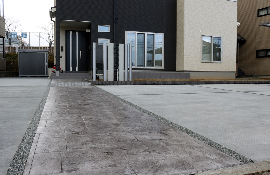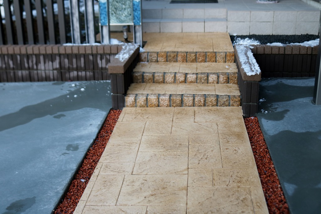 少し長めのアプローチを、スタンプコンクリートのヨーロピアンで施工しました。 長野市内のエクステリア施工実績