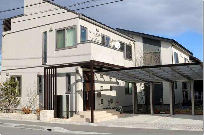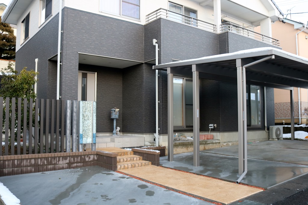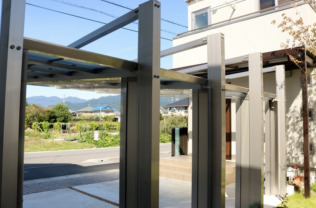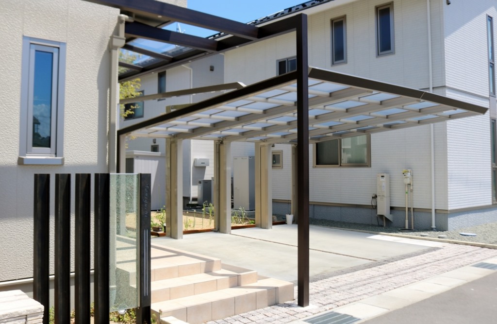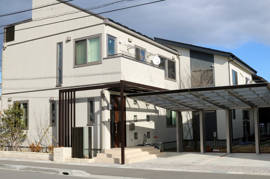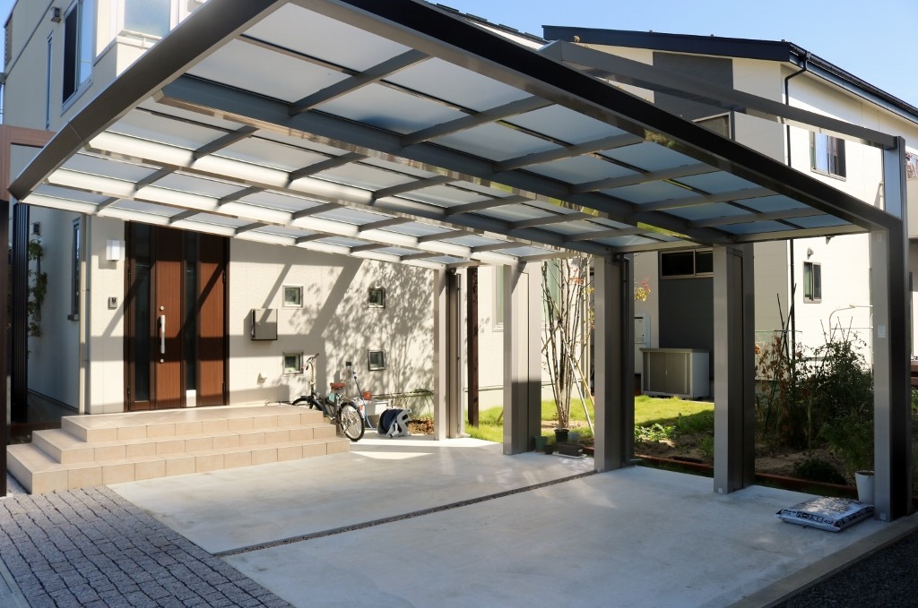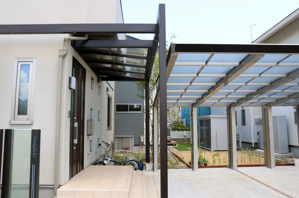 カーポートは四国化成のマイポートNext積雪60センチタイプの2台用で、車の出入りが楽な前面に柱が立たないカーポートで、使いやすさもお客様の要望でした。