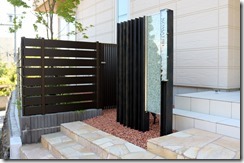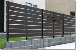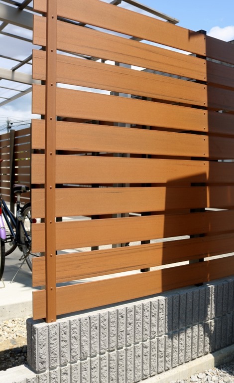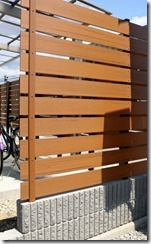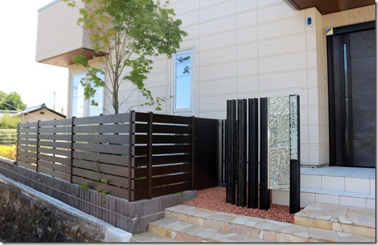 門柱の横に化粧ブロックを積みアルミの柱を立て目隠しフェンスのアルファウッドのブラックブラウンカラーを取り付けています。