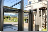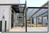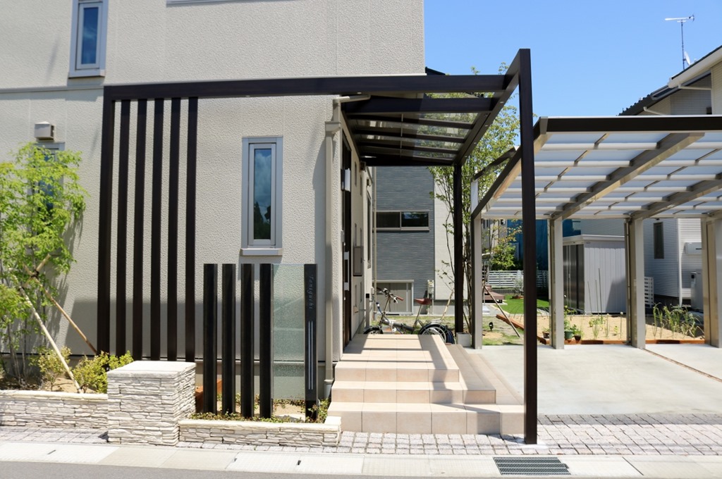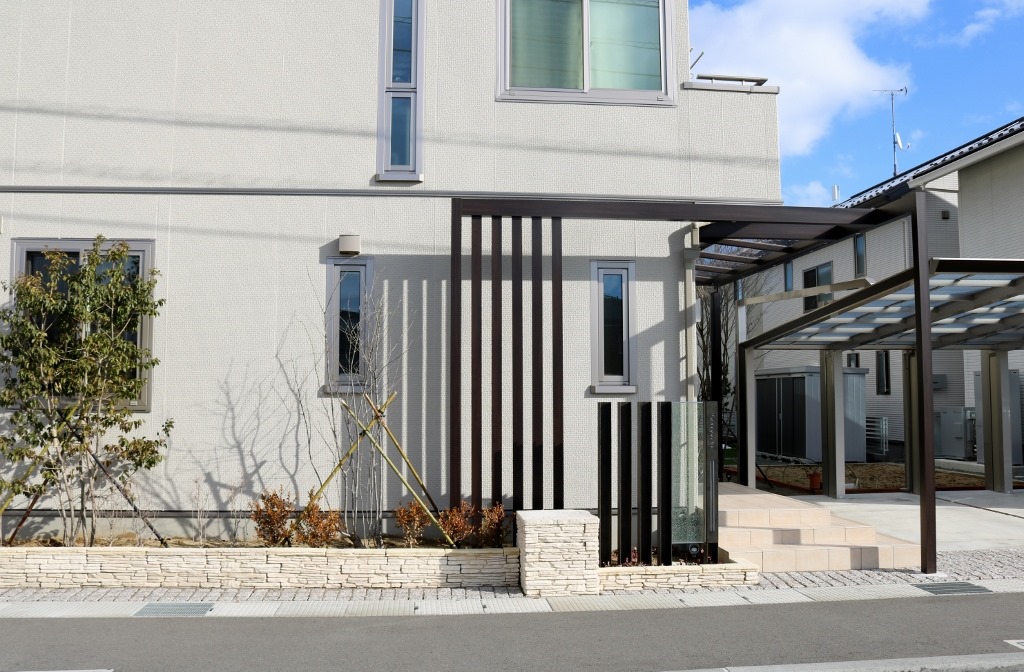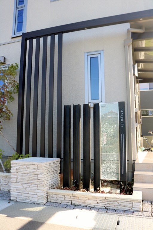 玄関前に取り付けたプラスGはフレーム・ルーフ・スクリーンを組み合わせて施工しています。マテリアルカラーのGフレームをT字形に組玄関前にルーフ(屋根)を取り付け道路側正面に立てにスクリーン柱を取り付けたプラスGの雰囲気を壊さないように門柱も、当社オリジナル商品で人気の高いH鋼の柱にジュエルグラスを取り付けた門柱デザインです。花壇は、門柱・プラスGがより素敵に見えるようにブラッドストーンを使用しました。