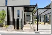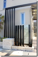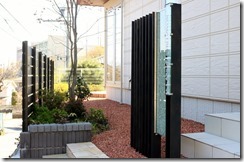 H鋼を特殊塗装で黒緑色で仕上げ、ジュエルグラスを挟み込んだプレミアム門柱の横に、アルミホワイトの角柱を5本立て廻りをテコラを敷き込みました。