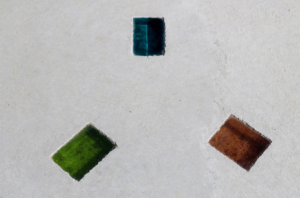 駐車のコンクリート目地をクリスタルグレインのブルーで舗装しています。 リサイクル瓶を粉砕して作られたガラスの粒をウレタン樹脂で固めた目地ラインです。