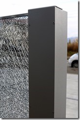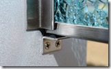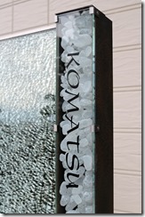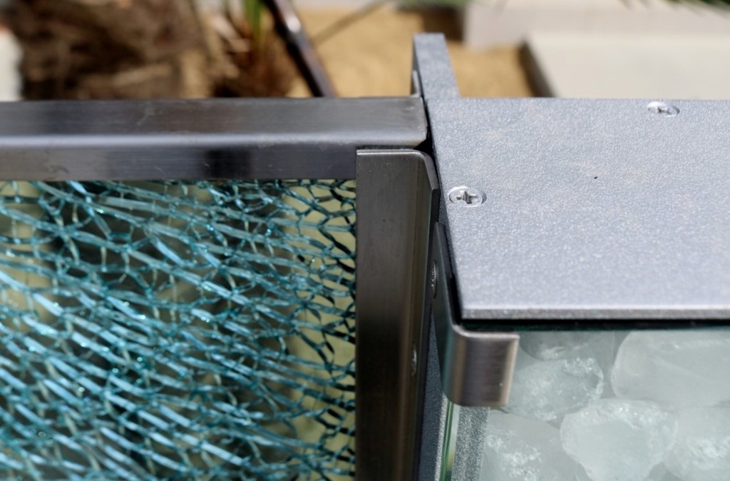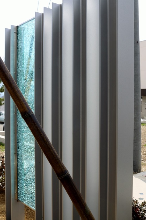 H鋼もアルミ製で作りました。 アルミ製のH鋼にサテンシルバーの塗装をしてカラージュエルグラスのブルーを挟み込み、合わせ硝子12㍉あるガラス板にサインを施し、中にオリジナルのLEDテープを取り付け、オリジナルの硝子玉のクリア・ブルーを入れて取り付けています。
