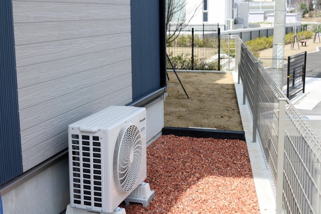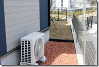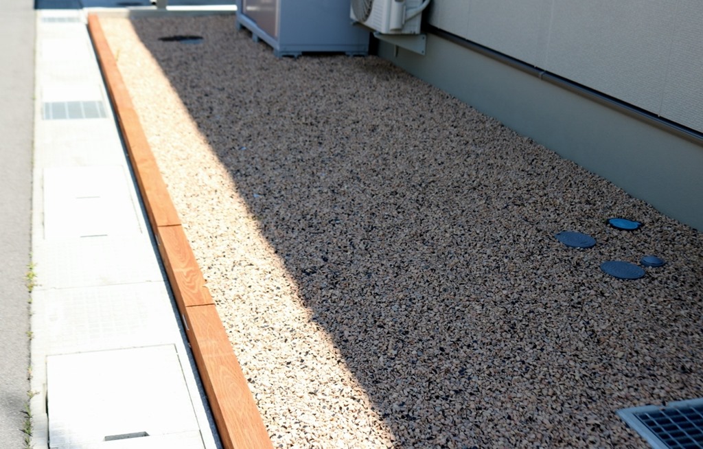 通路のコンクリート床にはカットダルを埋め込み建物の回りは防草シートを敷きその上にテコラを敷きこんでいます。