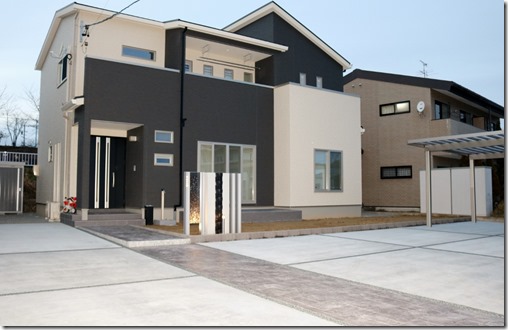 前方に柱の無いマイポート積雪用は全体のデザインを壊さず上手く溶け込んでいるように見えます。駐車場の入口部分には自然石を加工したグラニート・ピンコロを敷きこんでいます。