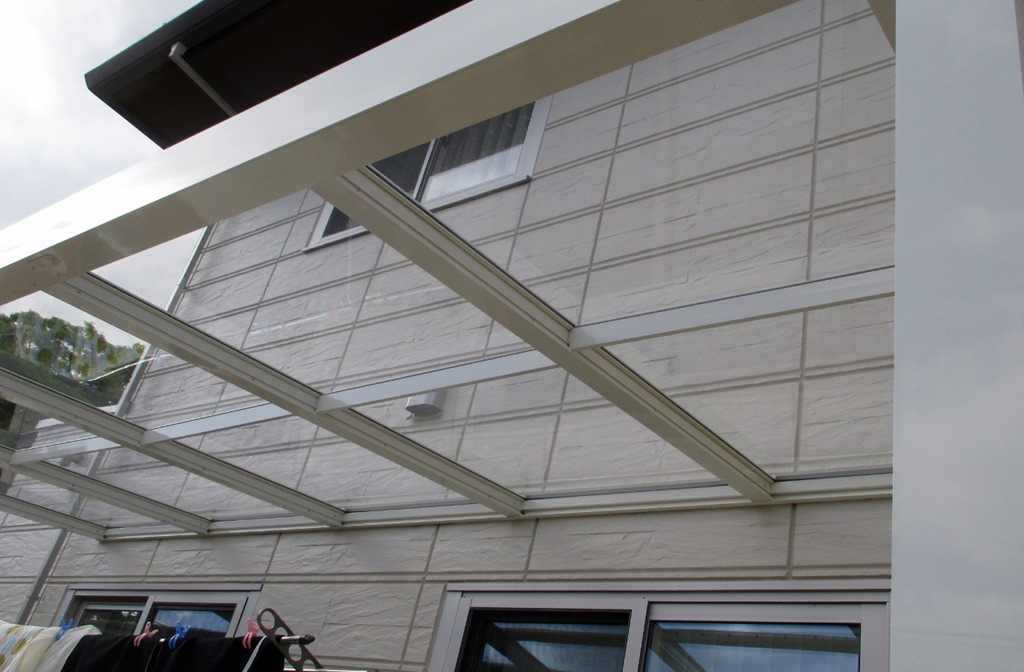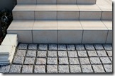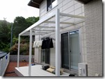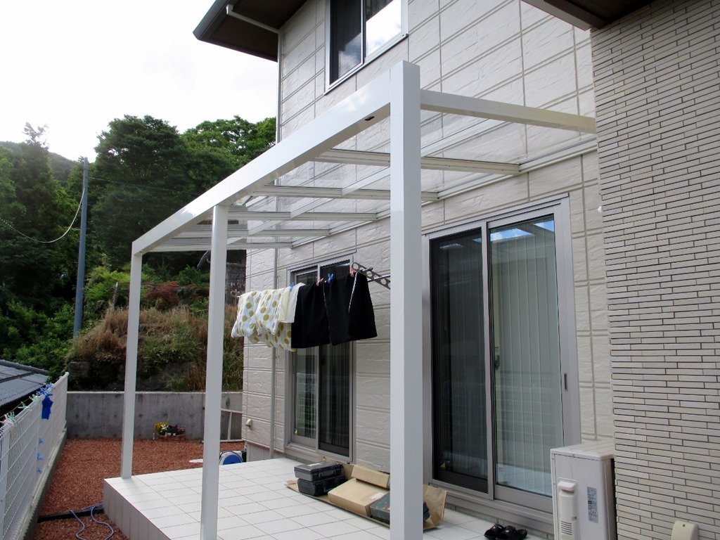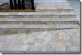 Gルーフテラスをタイル貼りの床に取付ています。 段数の多い天然石貼りのアプローチ階段。