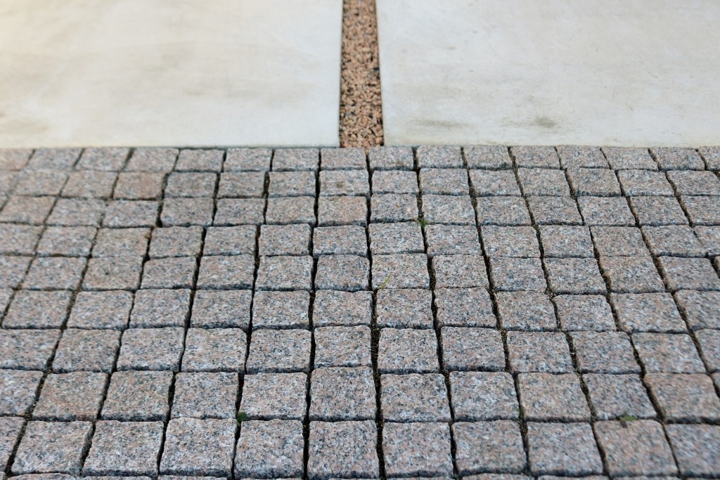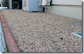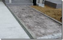 通路部分はスタンプコンクリートアシュラをグレーカラーで仕上げ目地部分は天然石の小砂利雅をウレタン樹脂舗装して仕上げました。