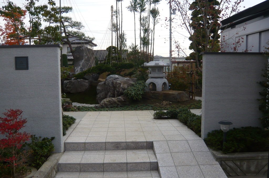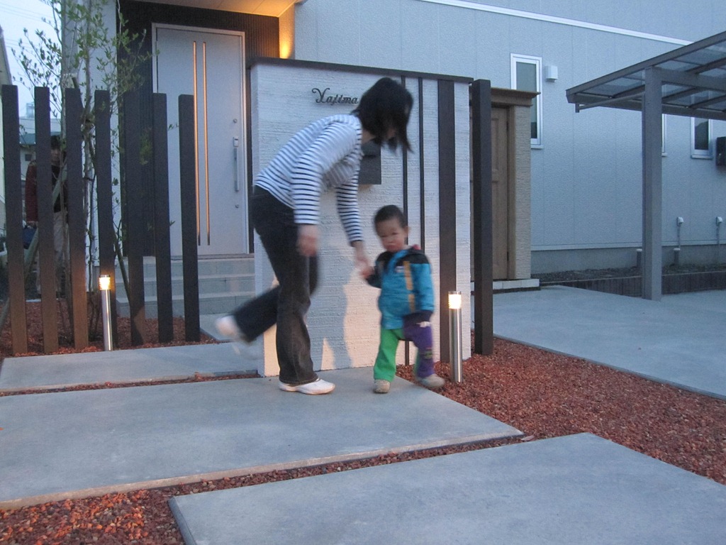 門柱の横から玄関に向かう途中に植えられたシンボルツリーの下にはガーデンアップライトを設置して下から植木を照らしています。また通路横にもガーデンポールライトが設置されていて、とても明るく歩きやすくなっています。 千曲市エクステリア。