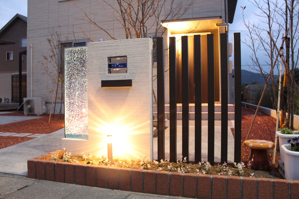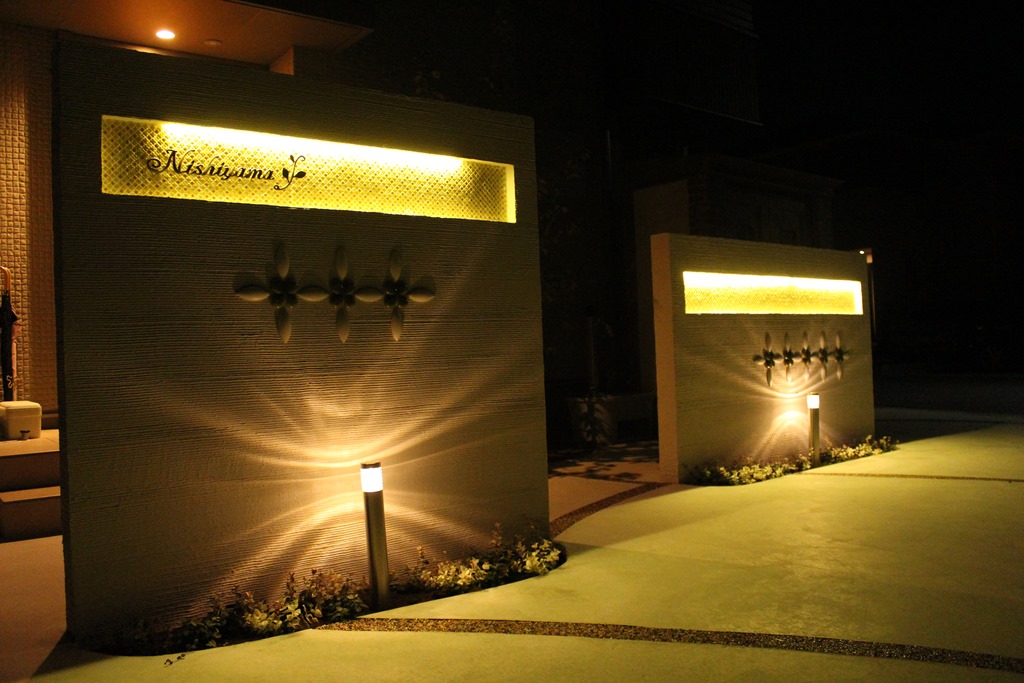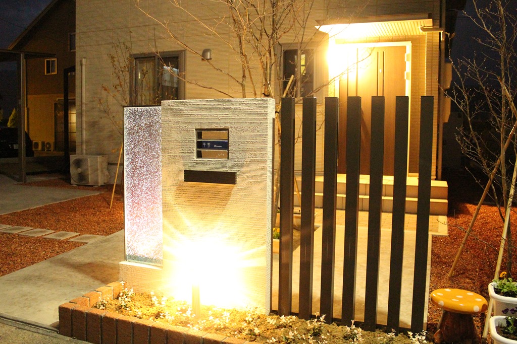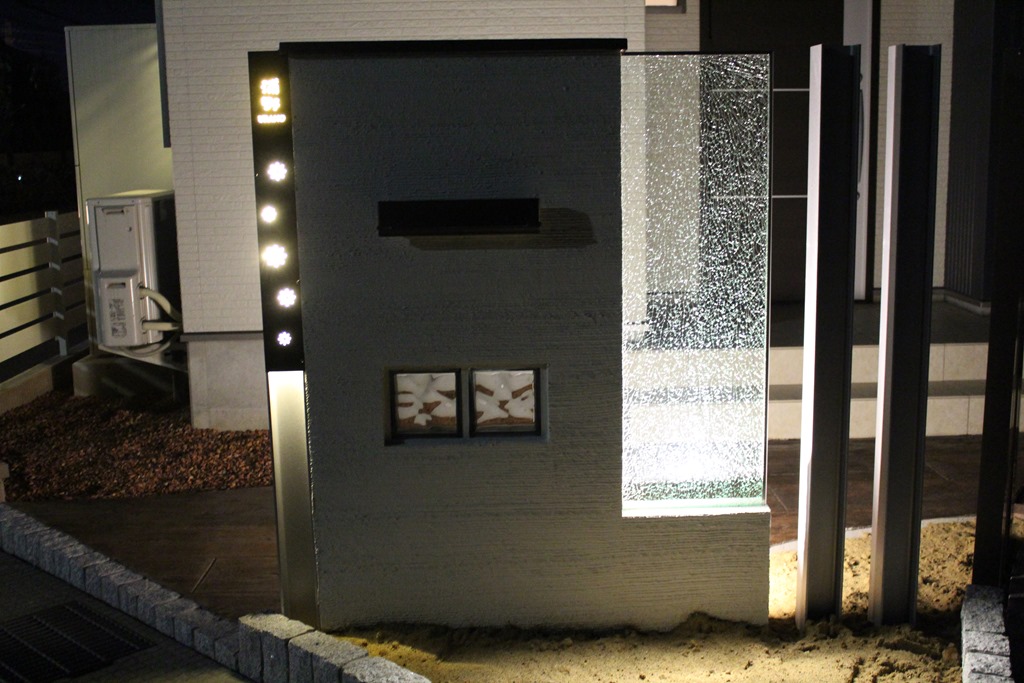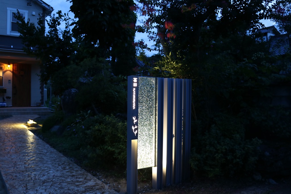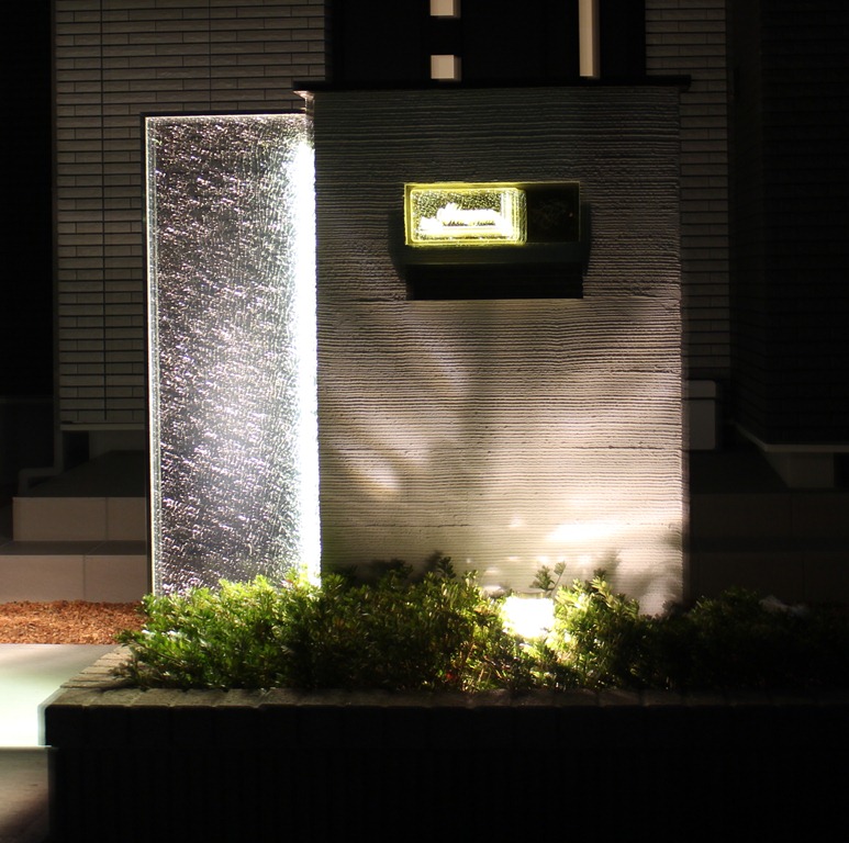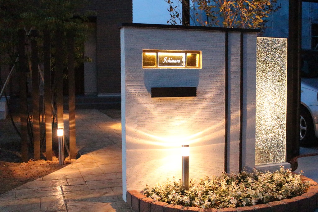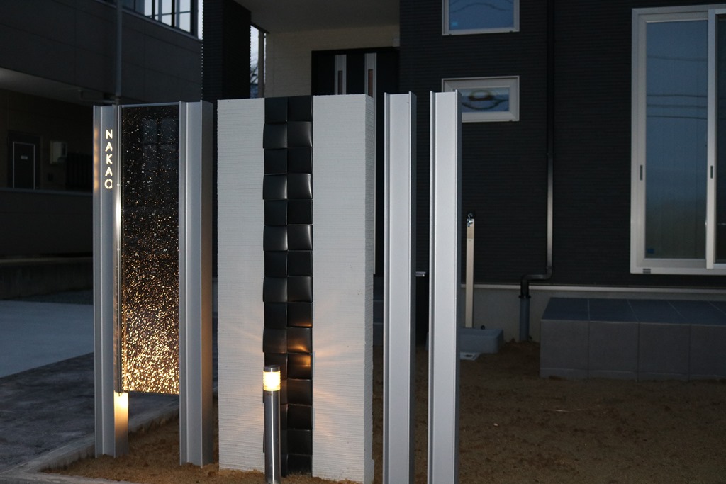 当社はオリジナルの照明を作り、門柱に取り入れる事が多いです。門柱の表面に凹凸を作り間接照明のように表札の取付部分を浮き上がらせたり、門柱に組み込まれたガラスパネルを輝かせたり、門柱の手前に照明を設置して明るく見せたりといろいろ外構に工夫をして施工しています。