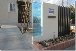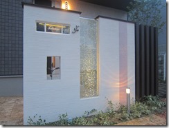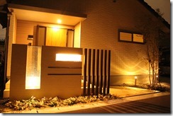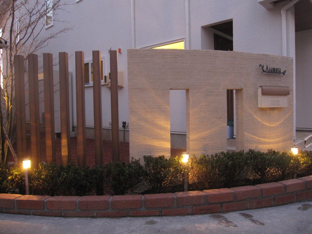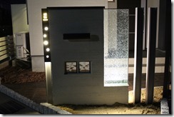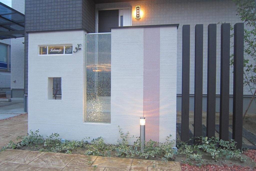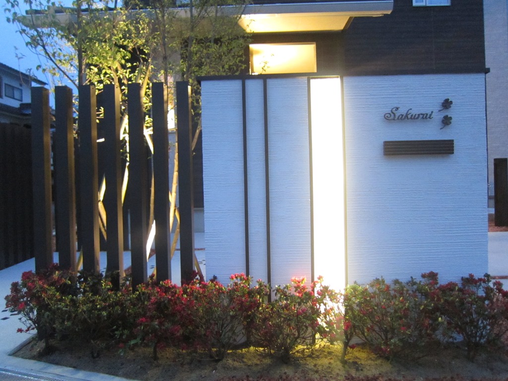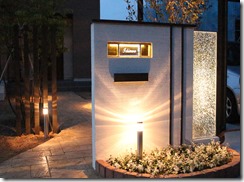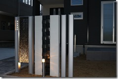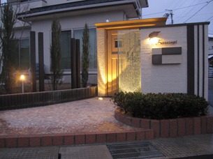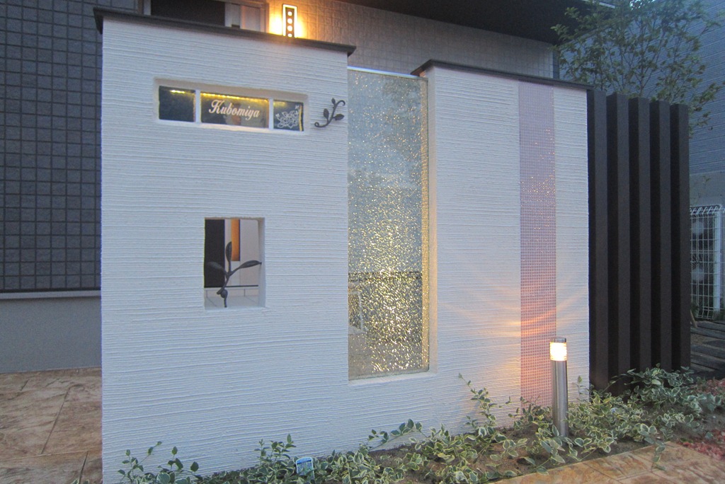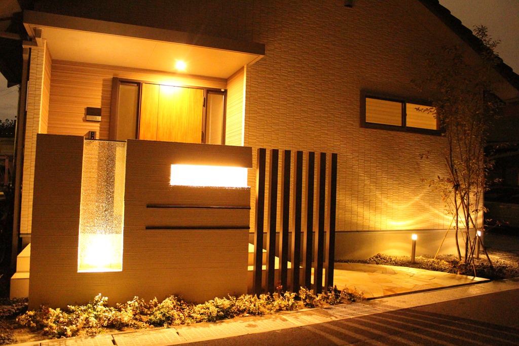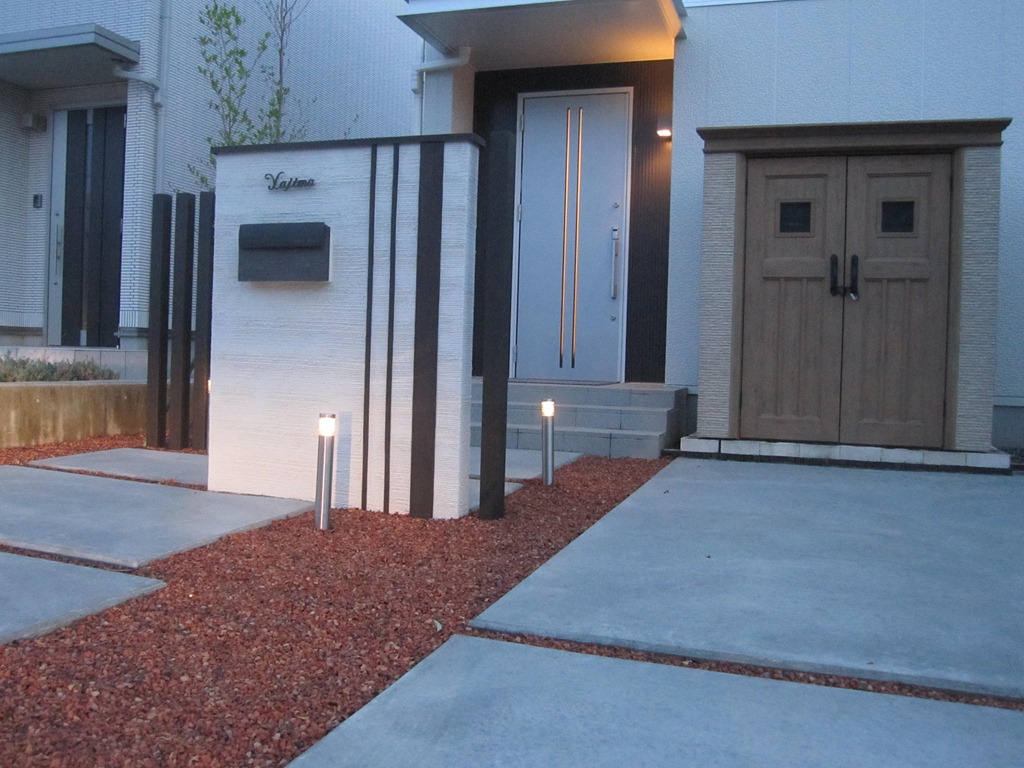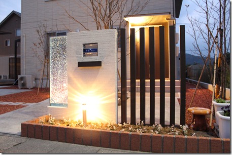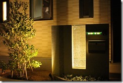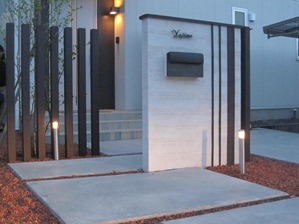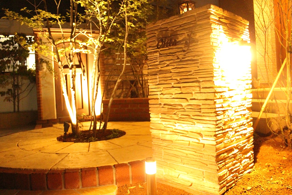 当社はオリジナルの照明を作り、門柱に取り入れる事が多いです。門柱の表面に凹凸を作り間接照明のように表札の取付部分を浮き上がらせたり、門柱に組み込まれたガラスパネルを輝かせたり、門柱の手前に照明を設置して明るく見せたりといろいろ外構に工夫をして施工しています。
