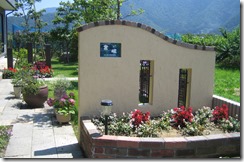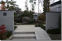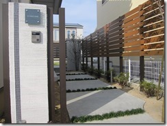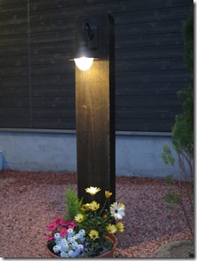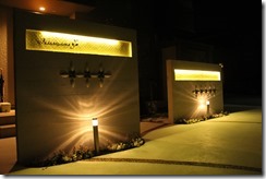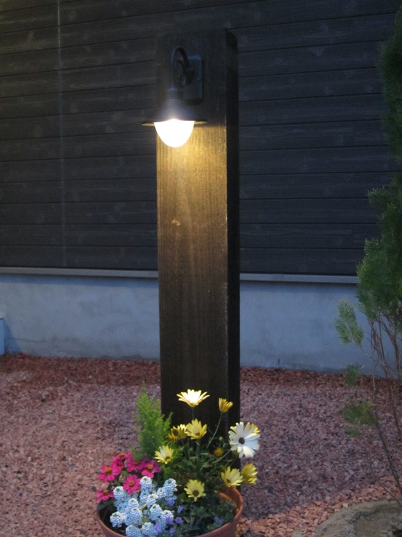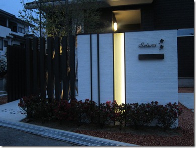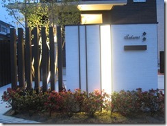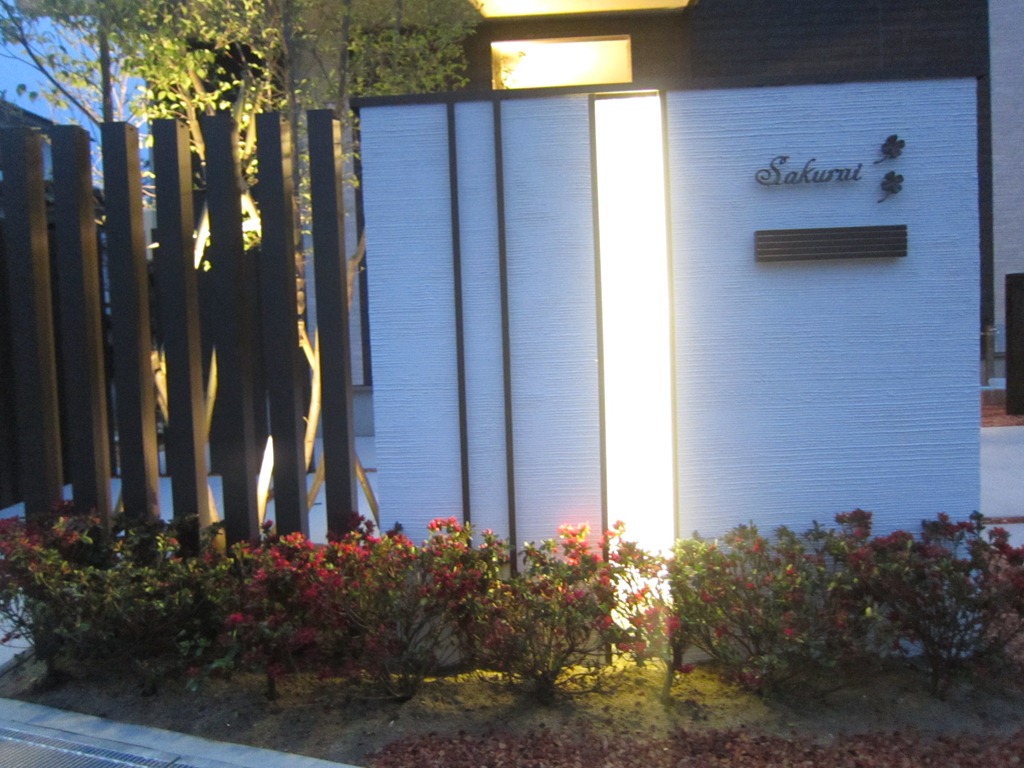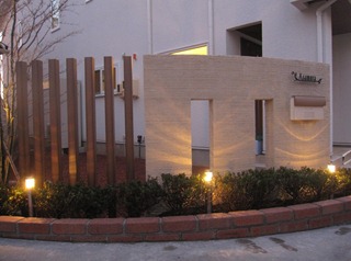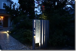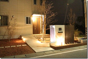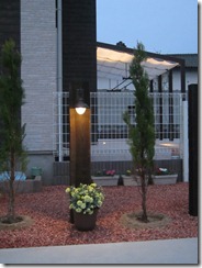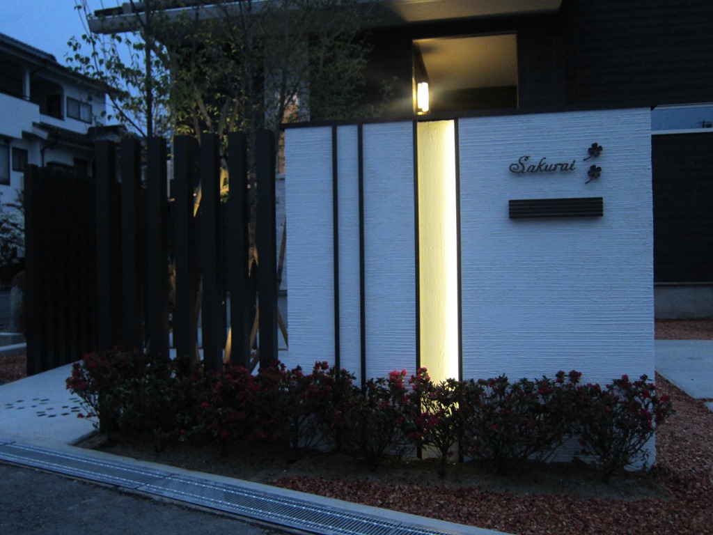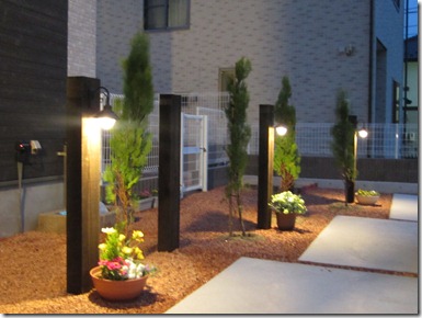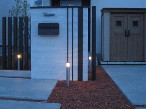 門柱裏にはローポールライトで植栽帯も照らしています。