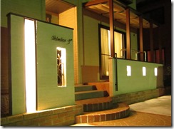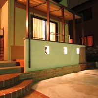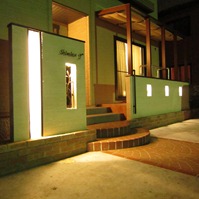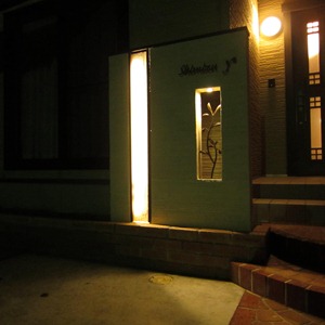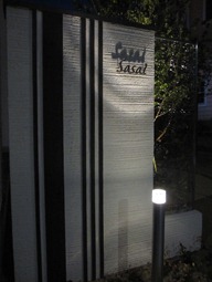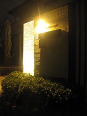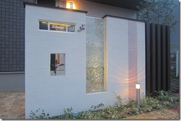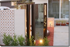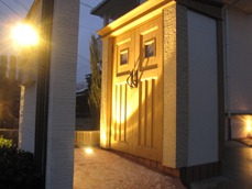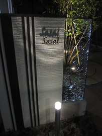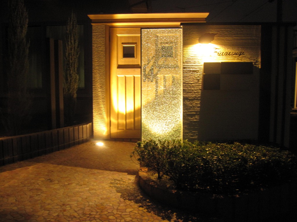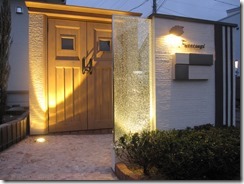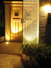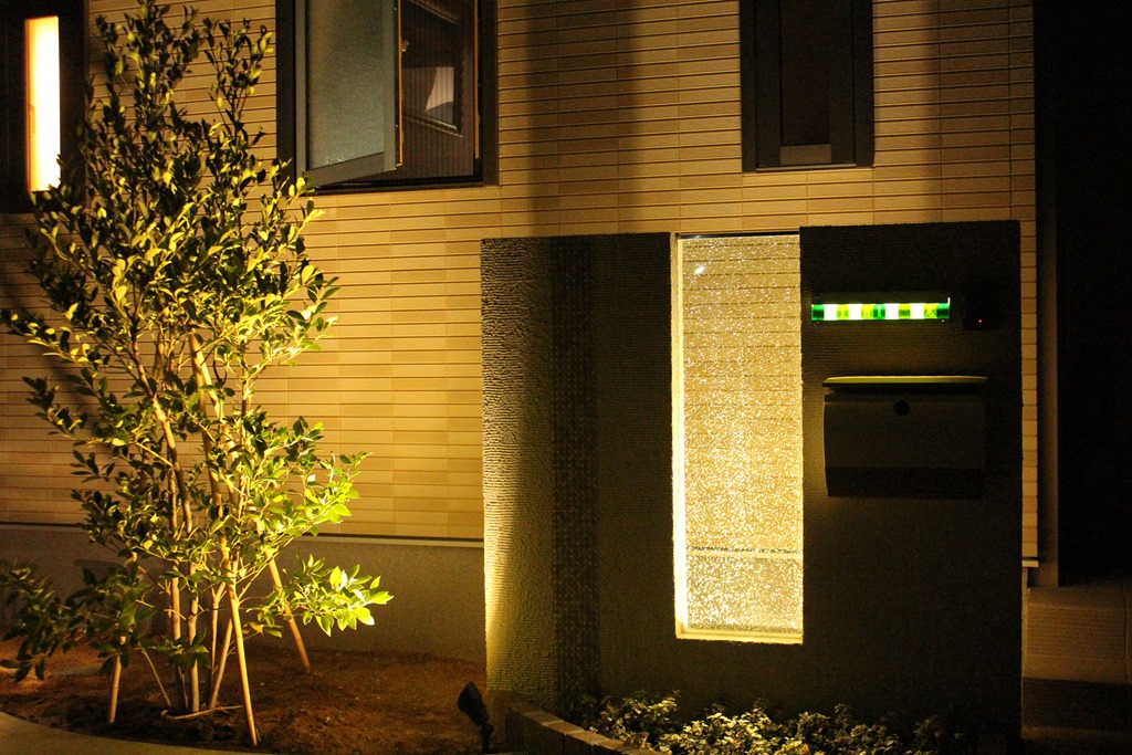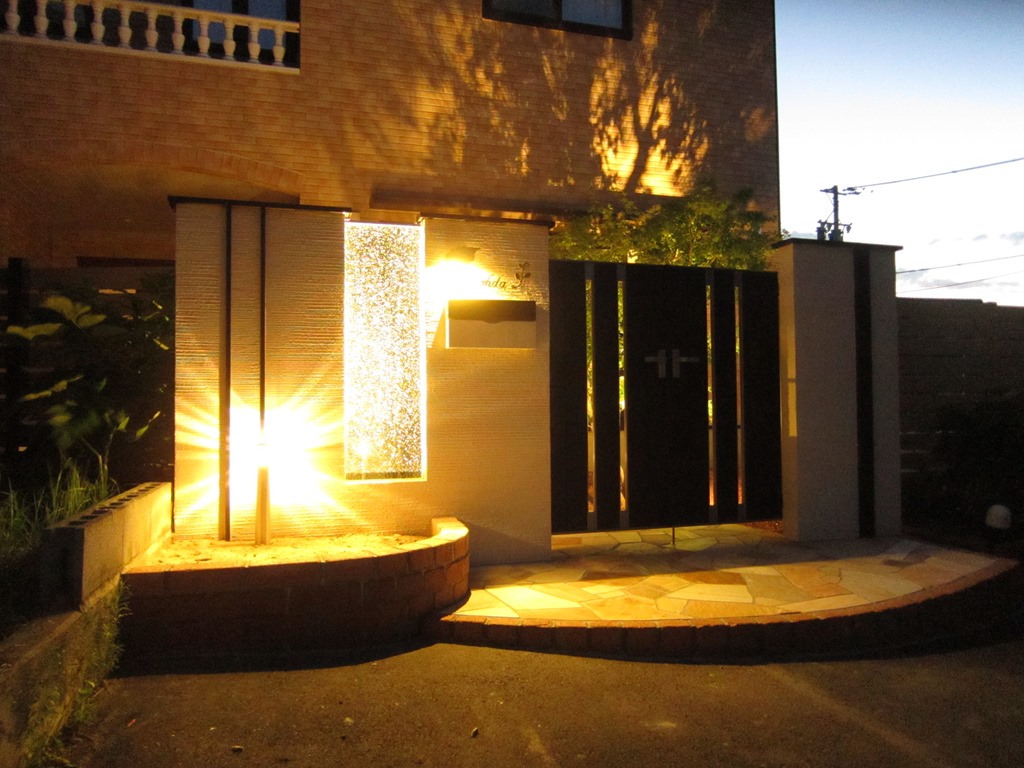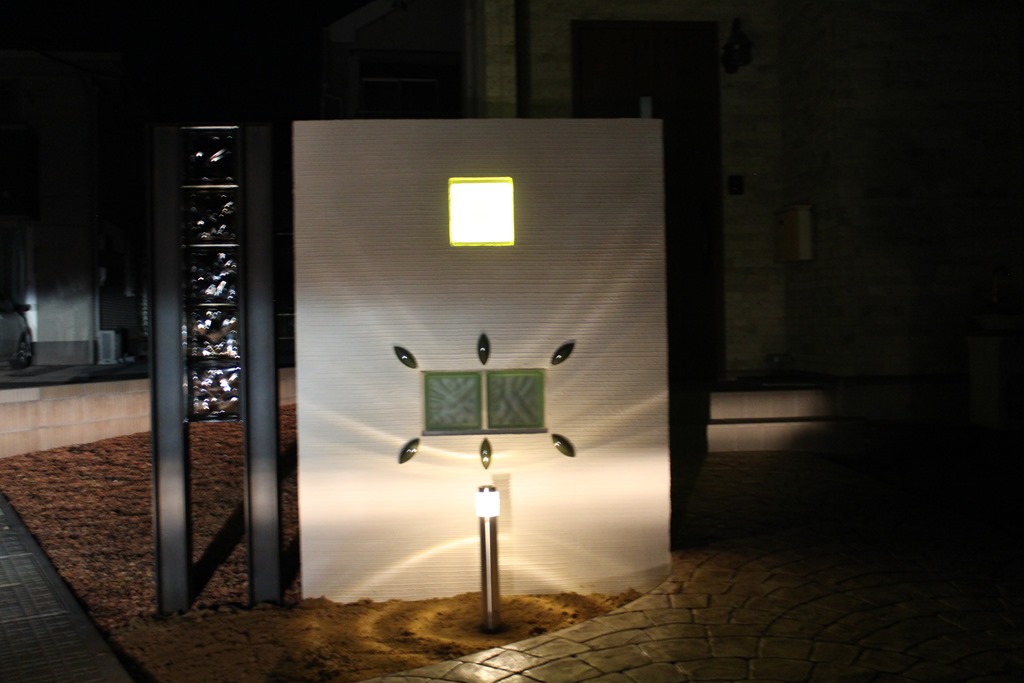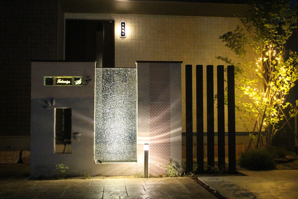 玄関の真正面に目隠しも兼ねて作られた門柱は、少し巾を広くして横にポールを立ててバランスを取りました。 この門柱は表札・ガラスパネル・モザイクガラスと3種のガラスが使われている現場です。そしてガラスと相性の良い照明をそれぞれのガラス部分に使いました。 ベネチアンガラスのサインには特注LEDバー・ガラスパネルのジュエルグラスの裏側からはLEDアップライト・モザイクガラスが貼られた壁の前にはガーデンポールライトを設置しました。