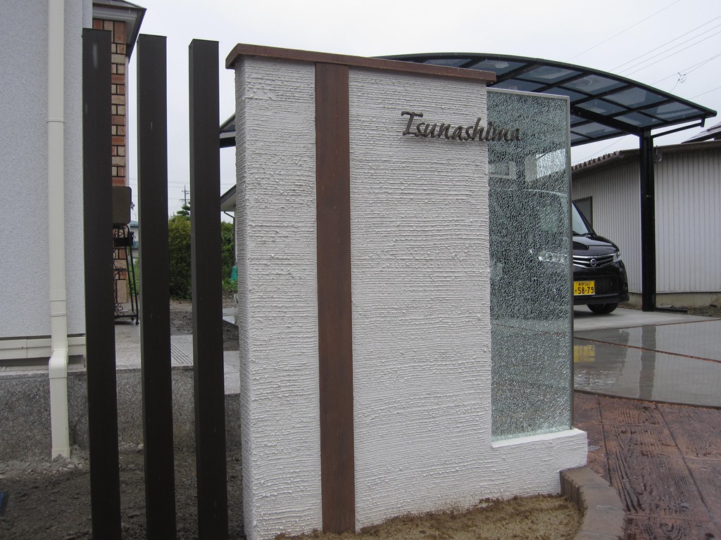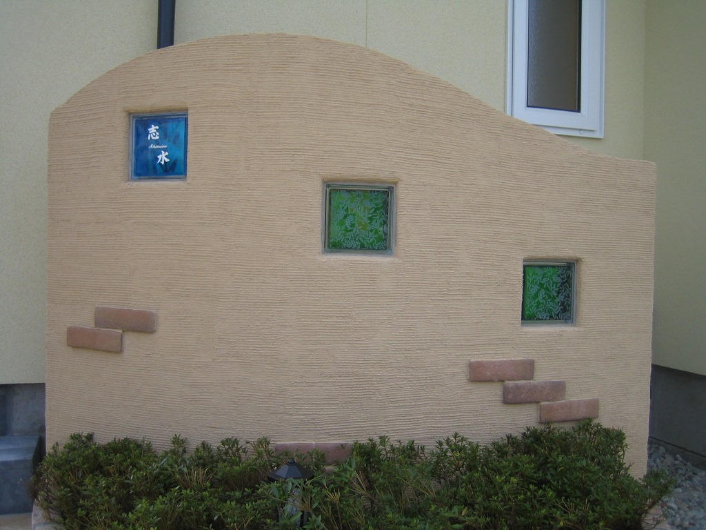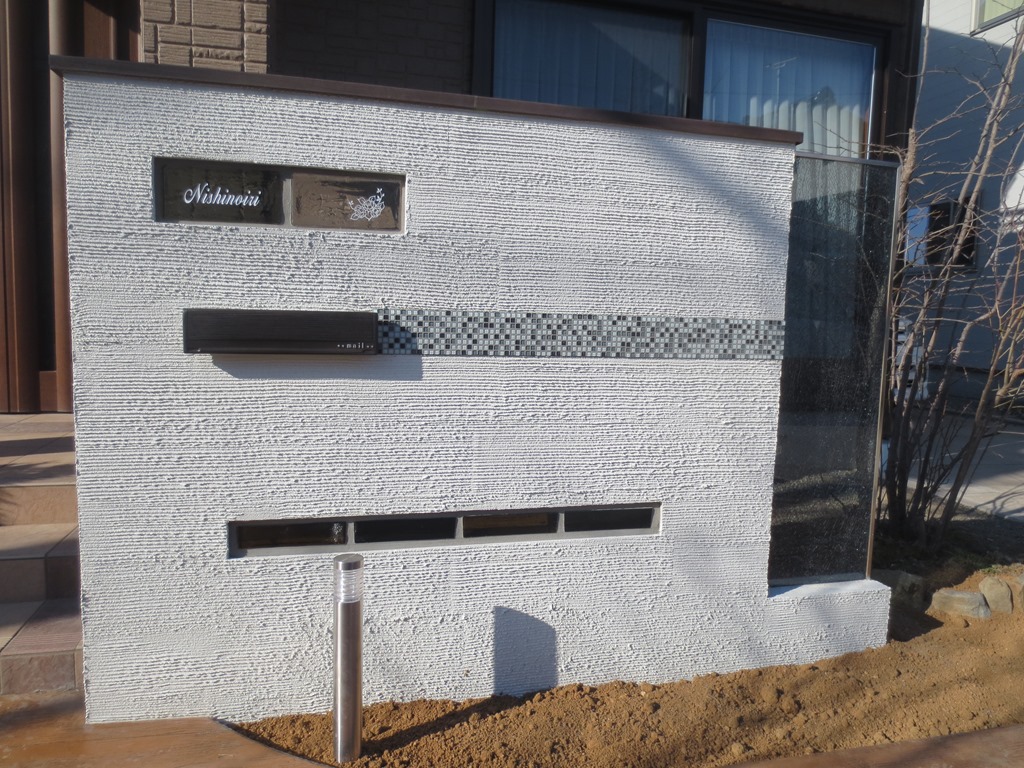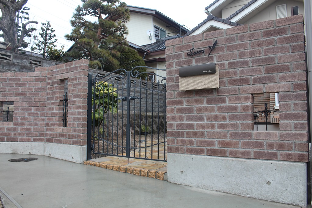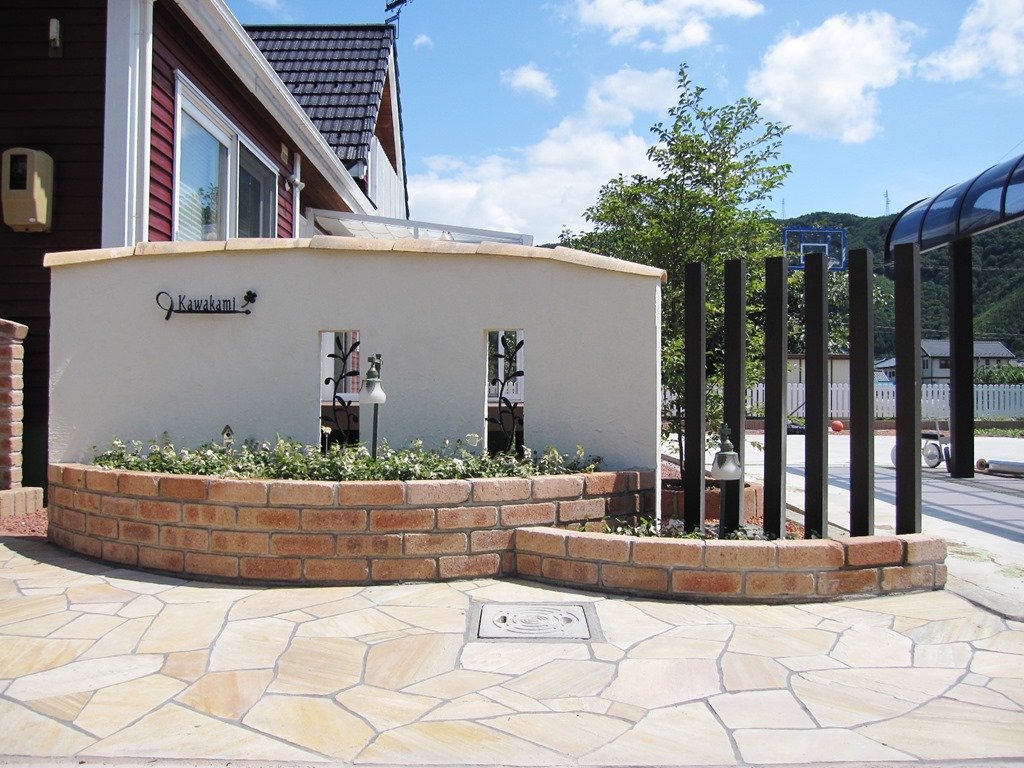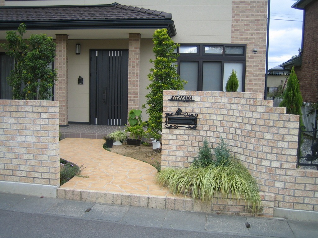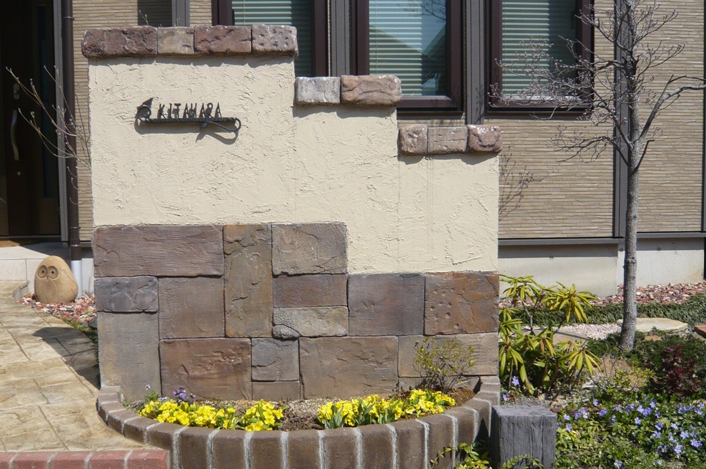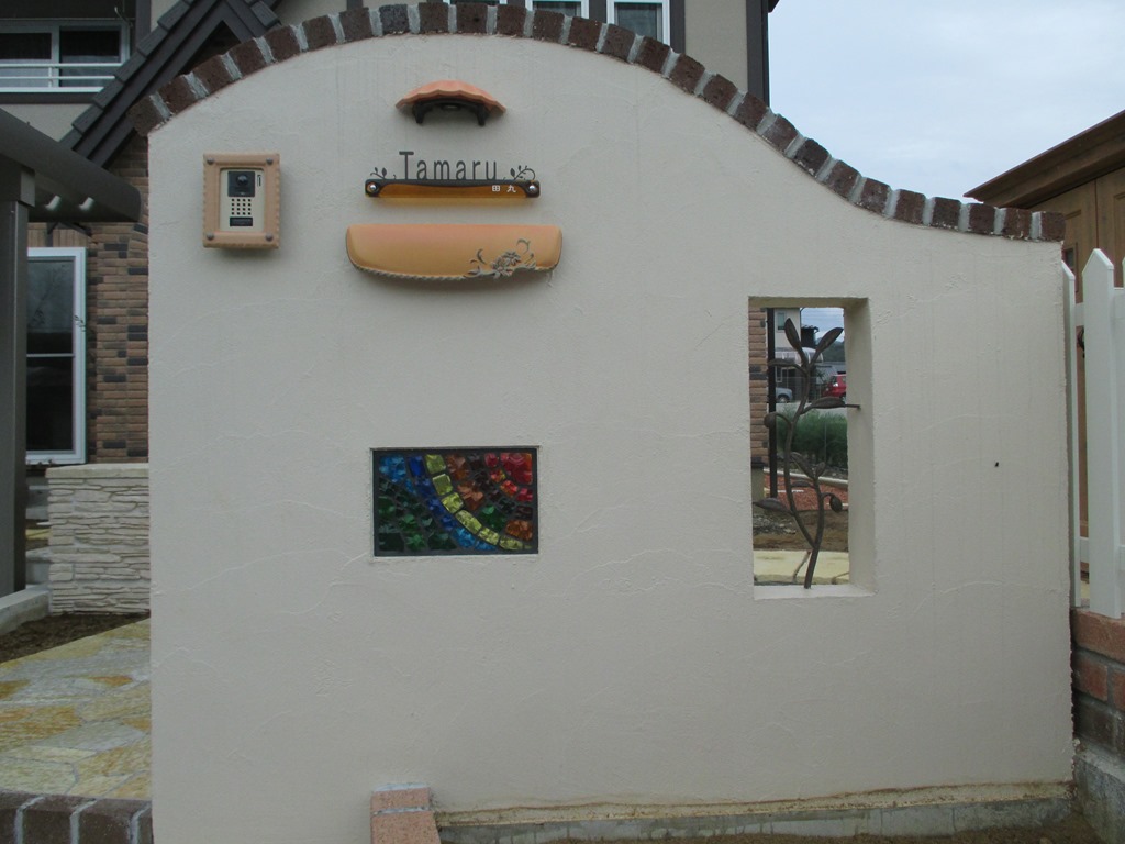 その他、コンクリート打ちっぱなしの門柱、塗り壁に煉瓦を埋め込んでみたり、お客様の要望でいろいろなデザインができます。