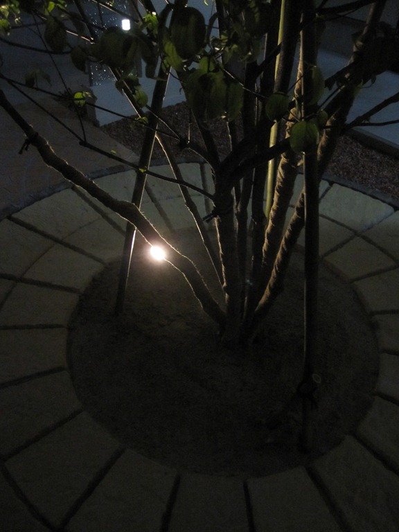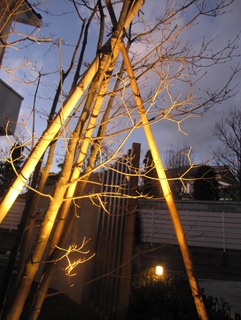 暗くなってから、照らし出されるシンボルツリーの木は庭の雰囲気をまた一段と素敵にしてくれています。 上田市のエクステリア照明の現場。