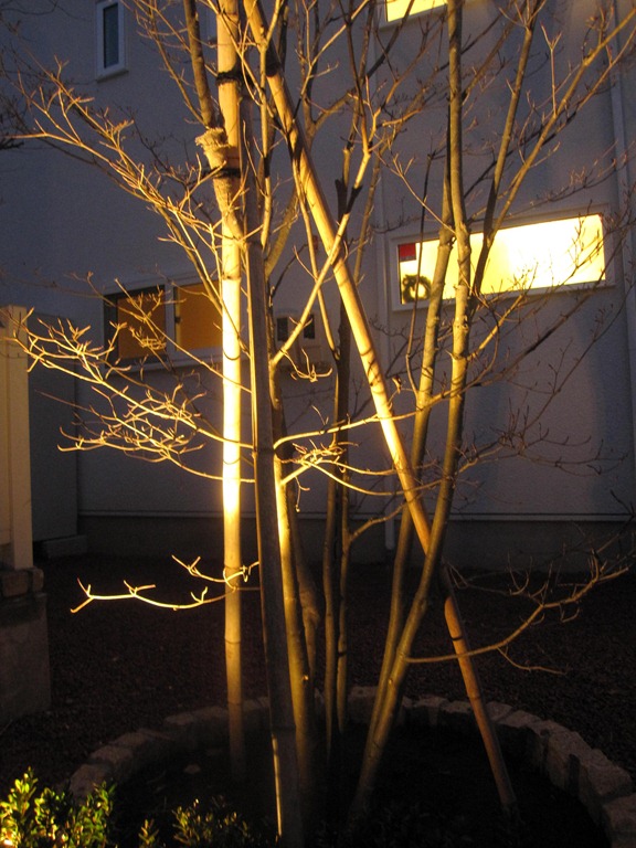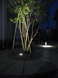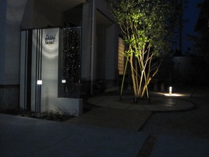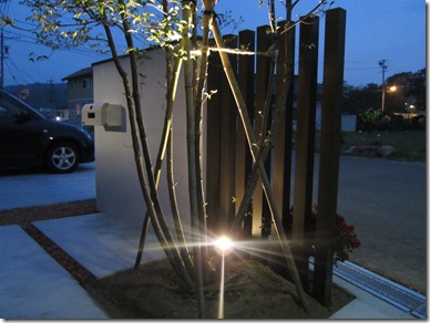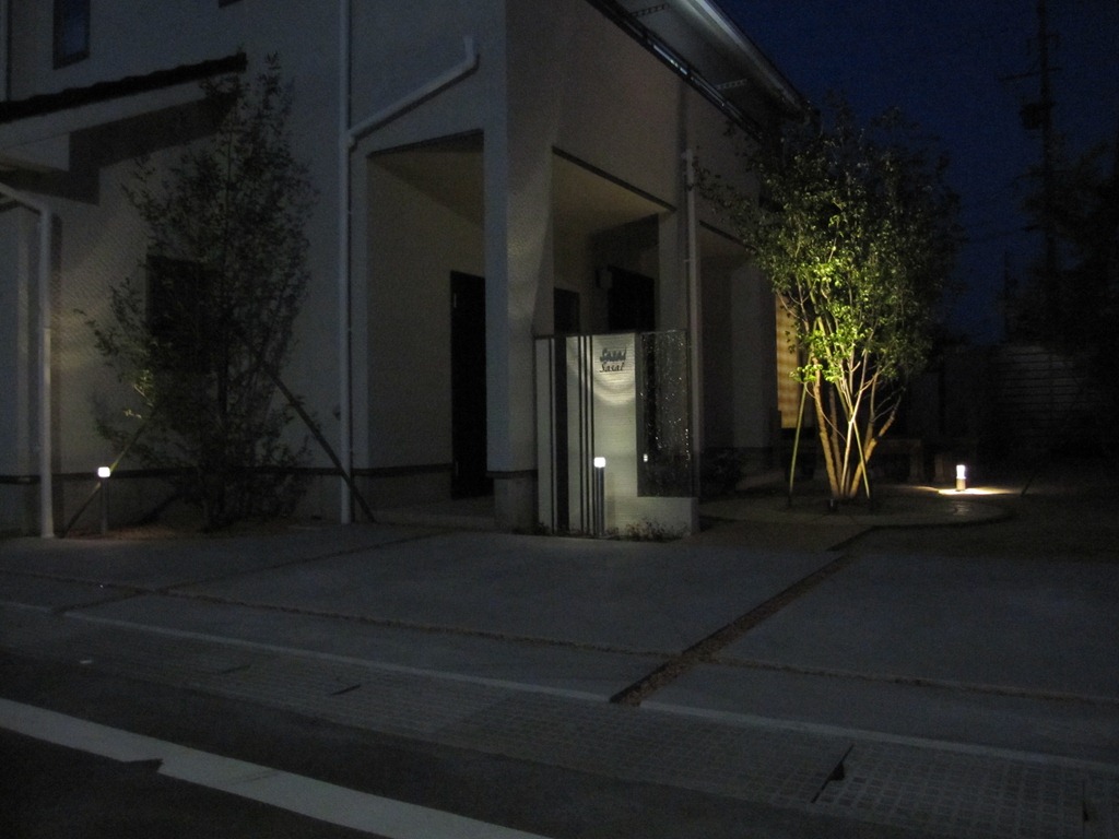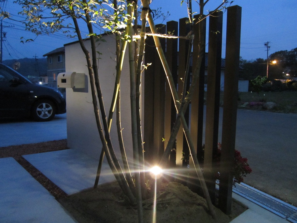 道路に面した門柱・駐車場のある現場にLED照明を数カ所設置して、夜のアプローチを歩きやすく、また夜の庭も楽しむ事が出来るようにヤマボウシとシャラの木をライトアップしました。機能的に使い易く、また昼間だけではなく夜も楽しむことのできる現場になりました。