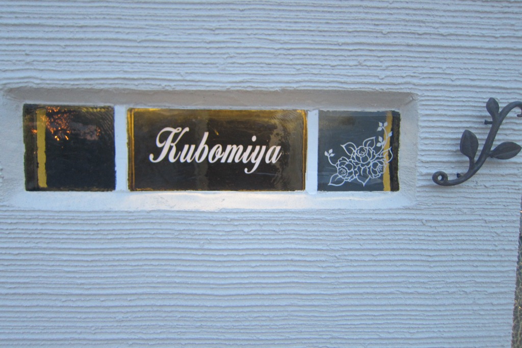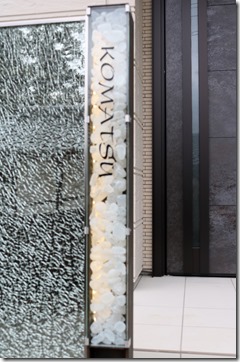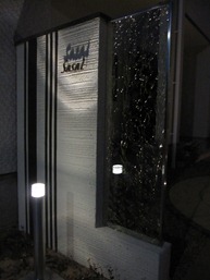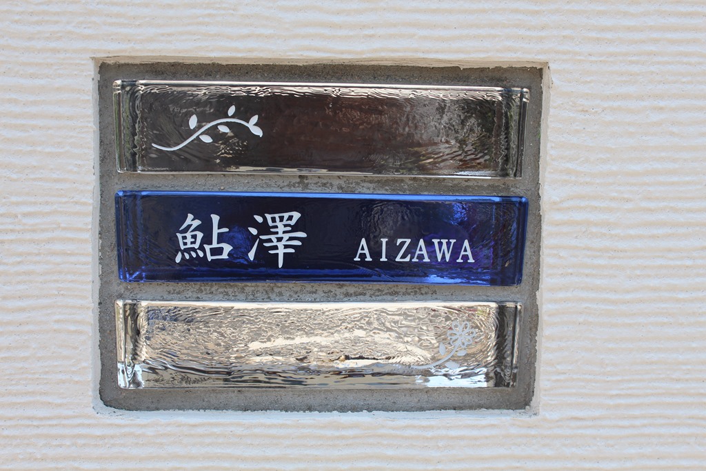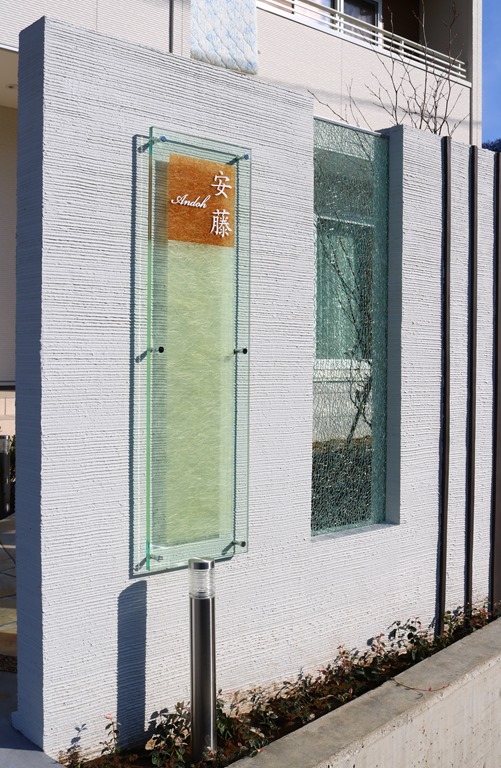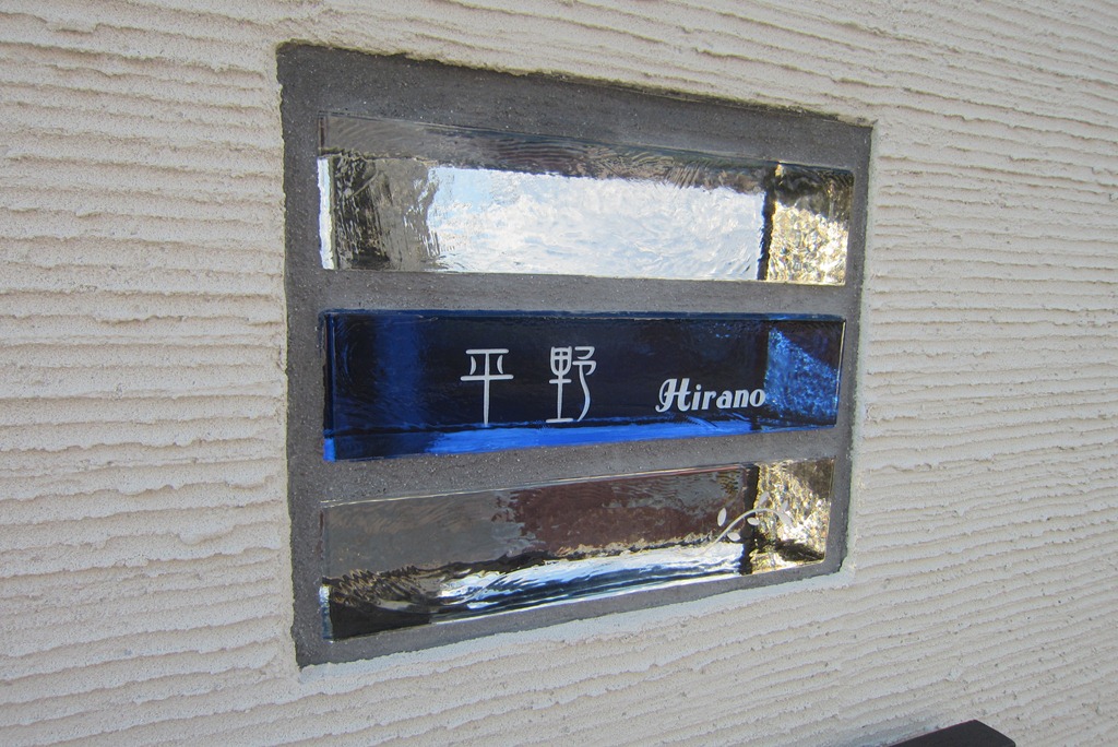 レンガサイズのクリスタル(ベネチアンガラスブリック)の広い面を彫るタイプと側面を彫って積むように施工するタイプの2種があります。光が透過してベネチアンガラスの魅力を引き出すサインは表側・裏側の両面から見ることのできるサインです、今までのサイン(表札)にはないスタイリッシュでシンプルモダンの建物に、とても良く似合ったガラスサインです。イタリア製のベネチアンガラスブリックを使用しています。