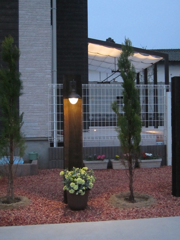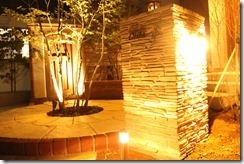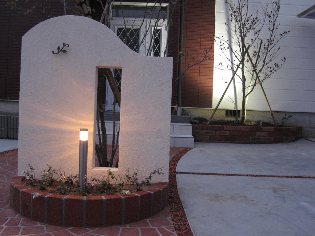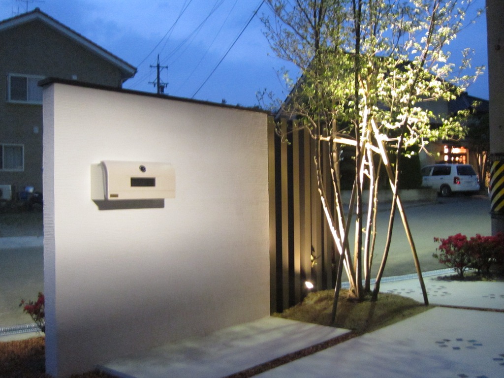 門柱の横に、同じ高さにして、アルミのポールを立て後ろ側にシンボルツリーを植え下からライトアップしています。 照明の灯りは壁があると綺麗に見えてきます。