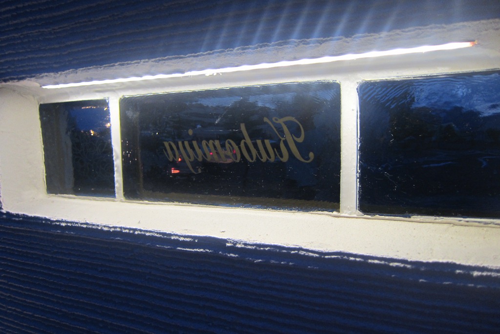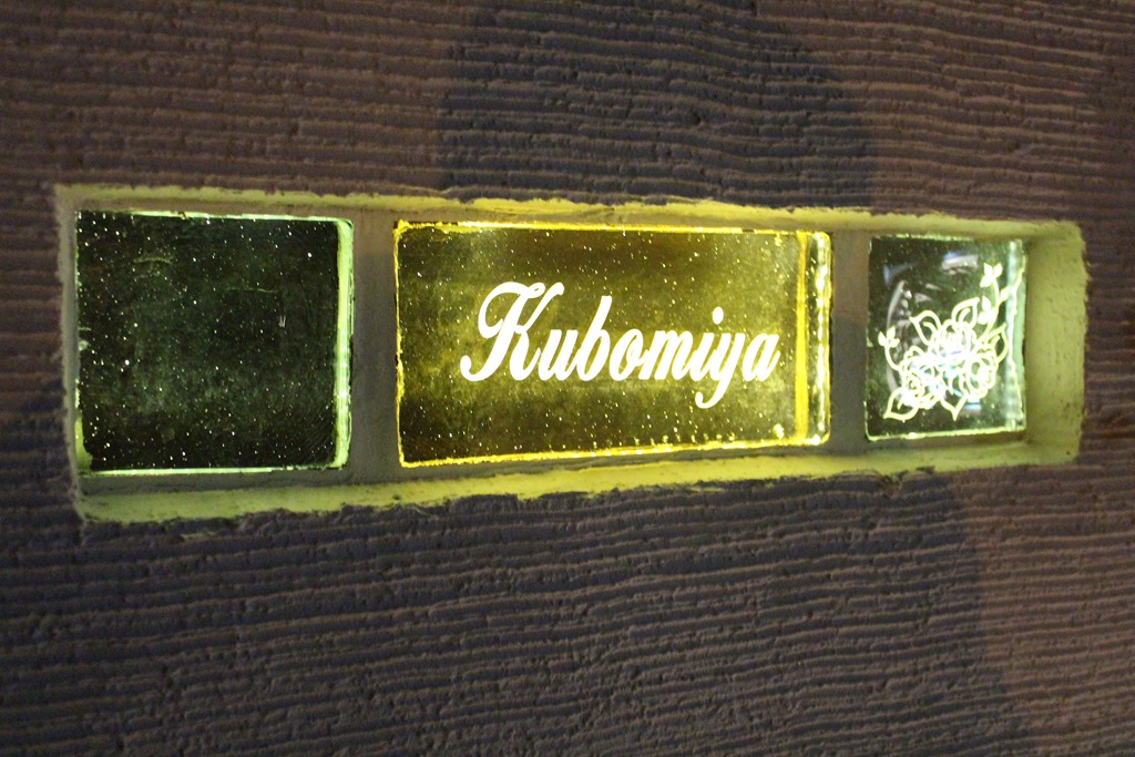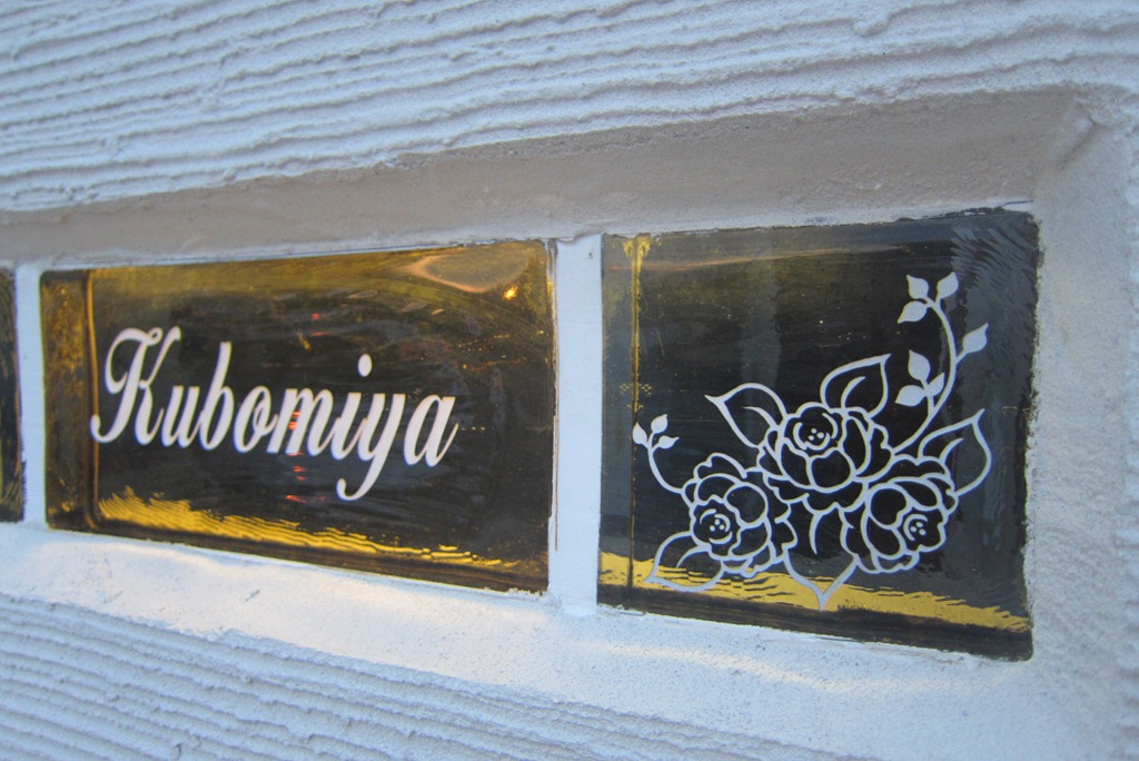 レンガとほぼ同じ大きさのベネチアンガラスに文字を彫りこみサインにしました。サインの横にはベネチアンガラスのハーフサイズに薔薇のデザインを彫りアクセントにして、今までにないオリジナルのサインにして、後ろ側の天井にLEDバーを取り付けることで、ほのぼのとした灯りが透過して光ります。 裏側から見てもぼんやりと正面に彫られた文字が見えます。