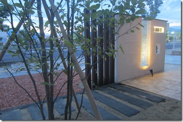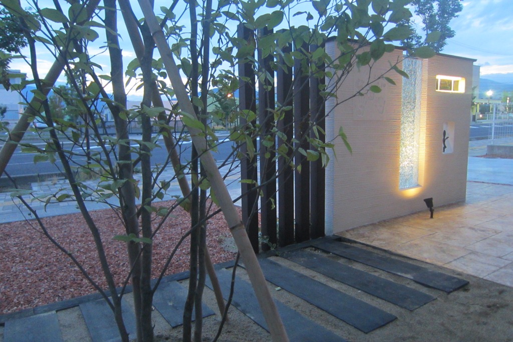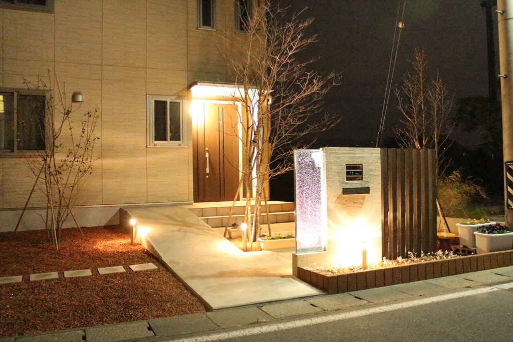 門柱に組み込まれたジュエルグラスは陽の光と夜のLED照明で、昼も夜もガラスの魅力を見せてくれます。ガラスパネルを使用して光のエクステリの提案で決めて頂いた現場です。門柱の横から玄関に続くアプローチの途中にサークルを施工して中央にシンボルツリーを植え込み、LEDのアップライトで樹に照明をあてる。足元だけを照らすのではなく、ガラスパネル・シンボルツリーを照らし夜のエクステリアを演出しています。