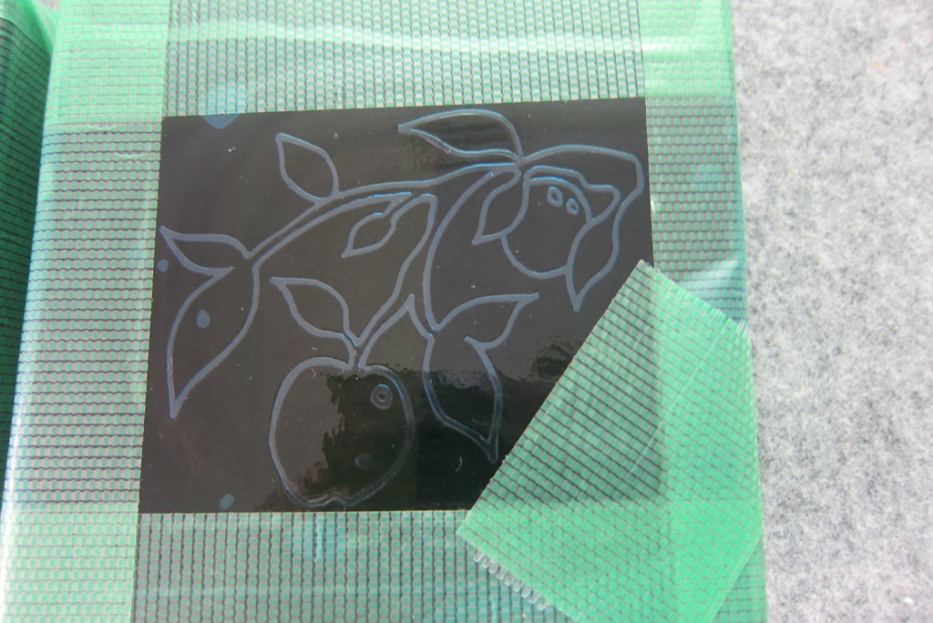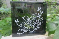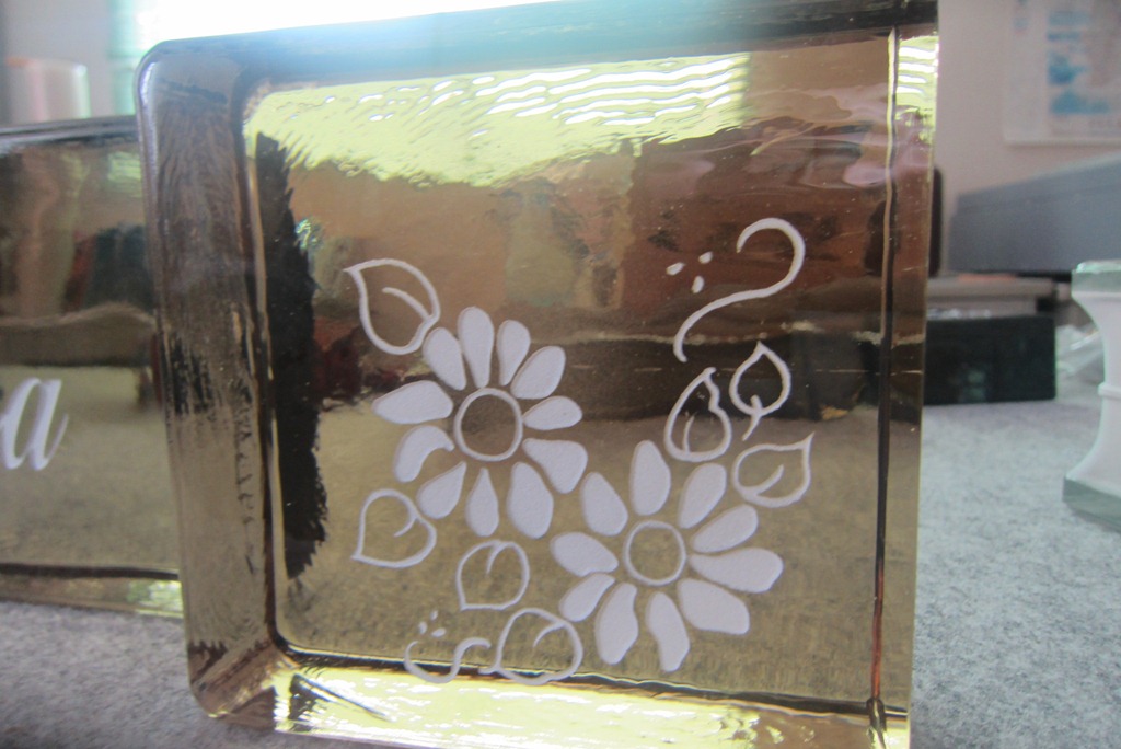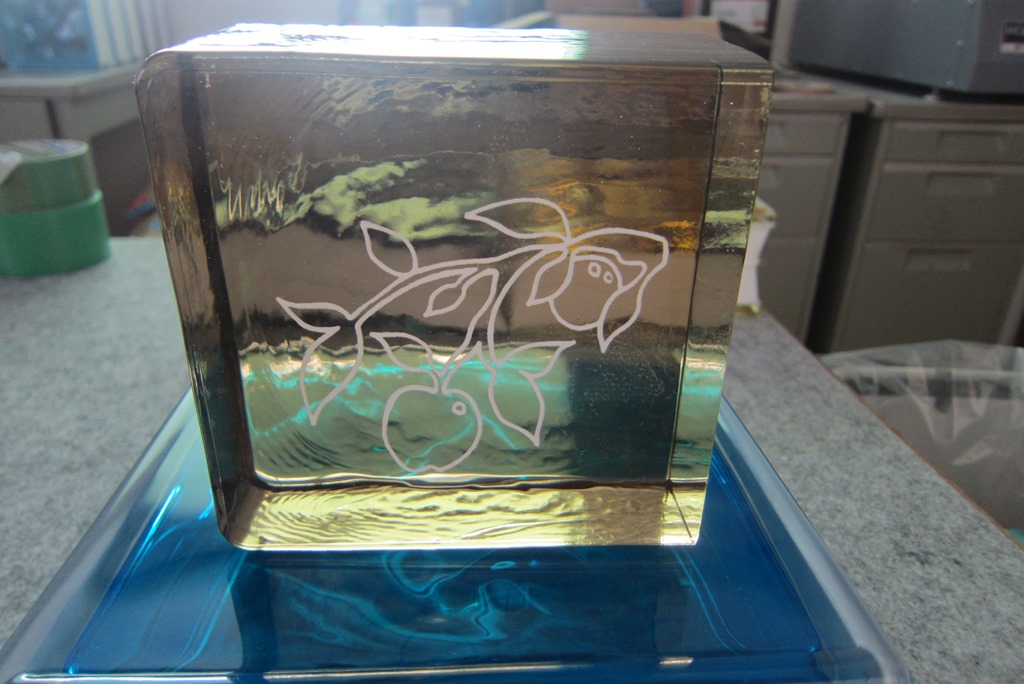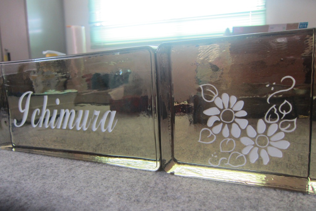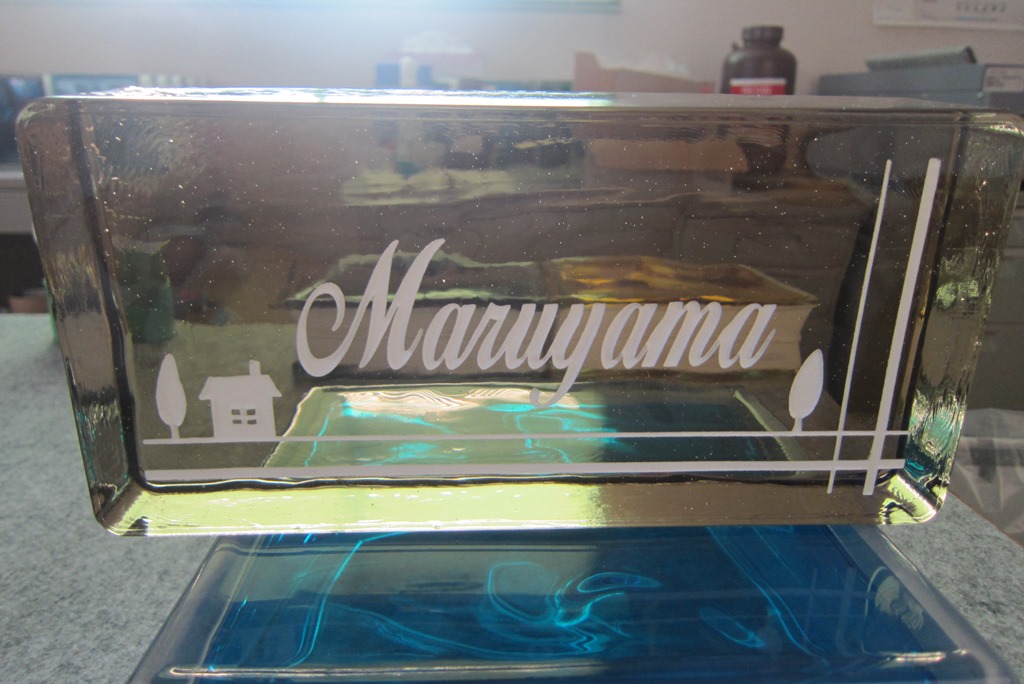 当社では、お客様に考えて頂いたデザインを作る事ができます。お客様が考えたデザインをコンピューターでトレシングペーパーにコピーして、樹脂を使いマスクを作ります、マスクのデザインされている部分は薄くなっていてサンドブラストで吹き付けると、その部分だけが彫れます。