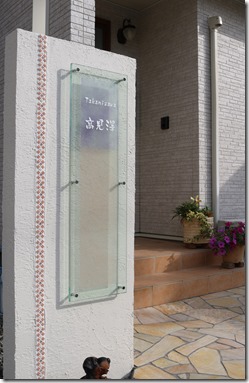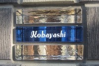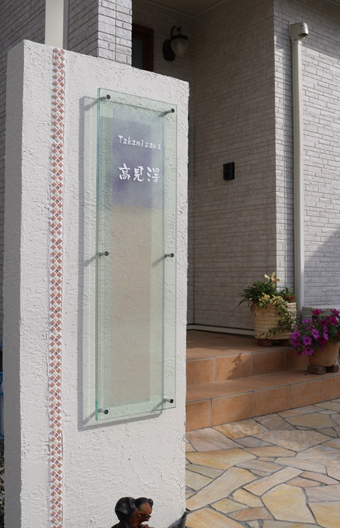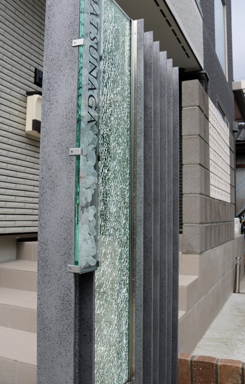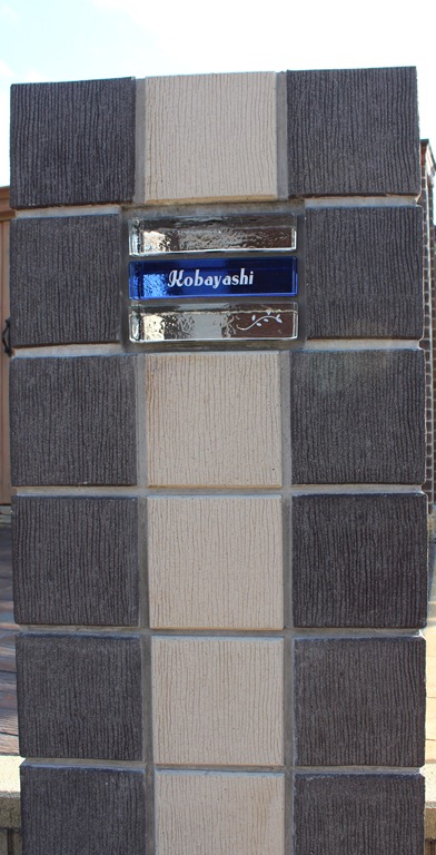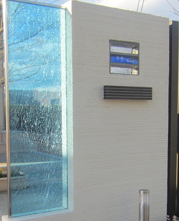 門柱に取り付けられたジュエルグラスはカラーのブルーを使用しています、表札もベメチアンガラスのブルーとクリアーを組み合わせています、クリスタルは光を透過させるのが良くわかると思います。