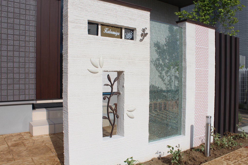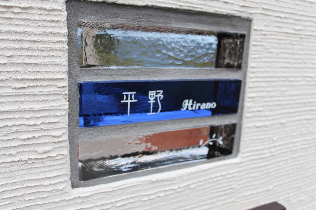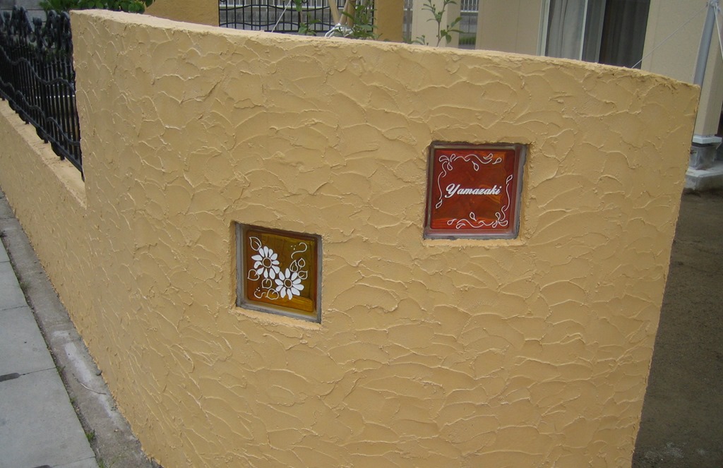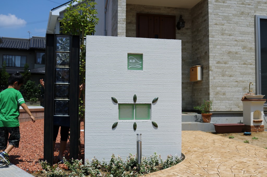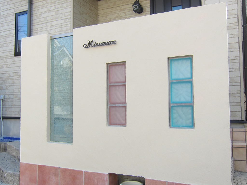 ガラスブロックサイン・デザインを取り入れたエクステリアの門柱は、ひとつひとつ当社が彫りこんで製作したものです。お客様のオリジナルデザインで作ったり、お客様自身に彫り作業をして頂くこともできます。思い出に残るエクステリア工事になると思います。