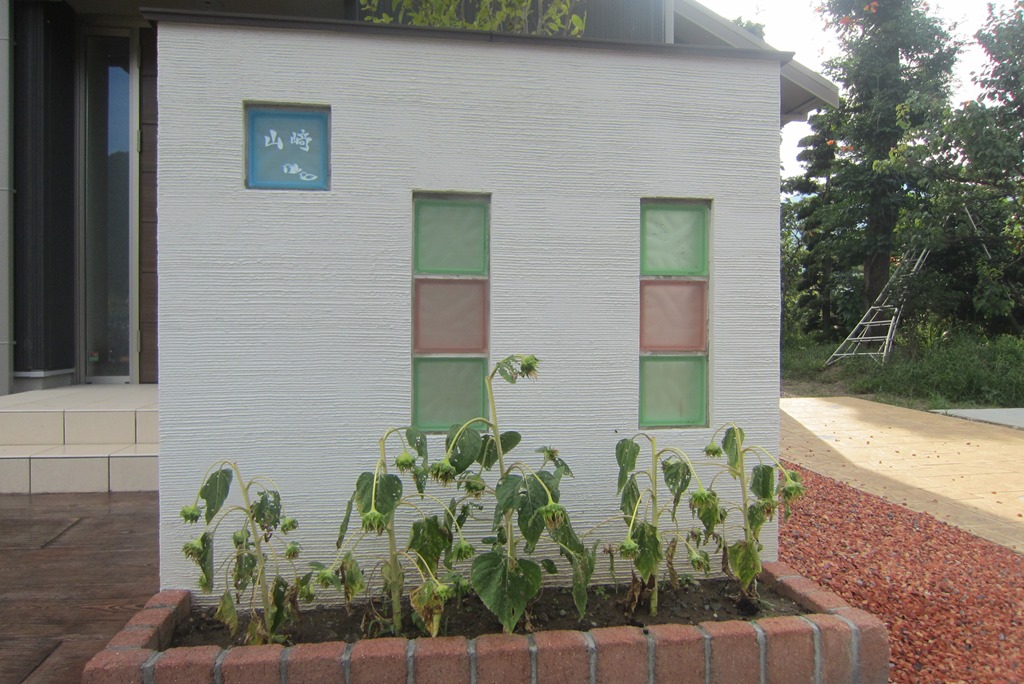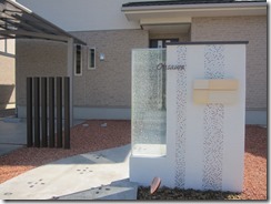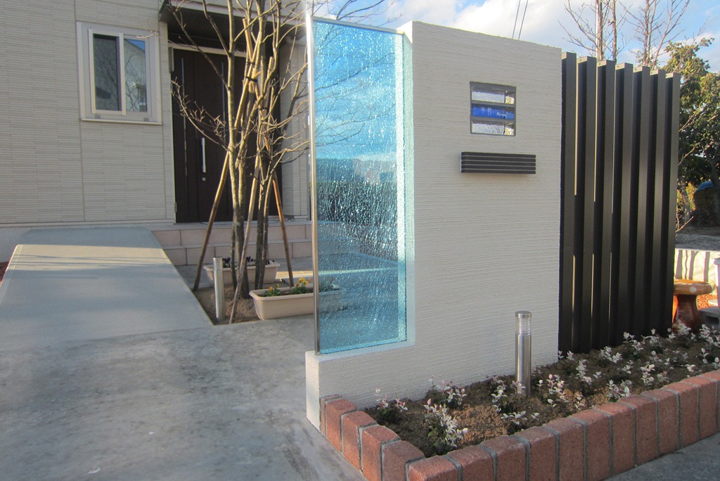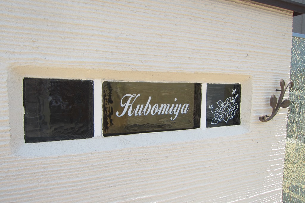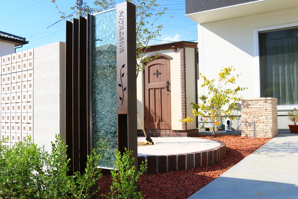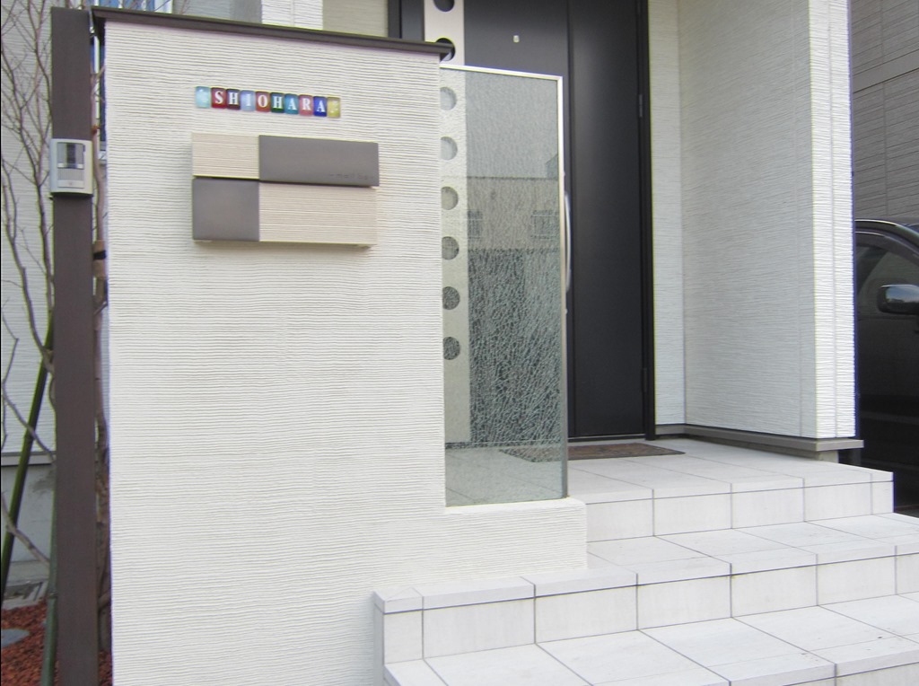 ガラスブロックサイン・デザインを取り入れたエクステリアの門柱は、ひとつひとつ当社が彫りこんで製作したものです。お客様のオリジナルデザインで作ったり、お客様自身に彫り作業をして頂くこともできます。思い出に残るエクステリア工事になると思います。