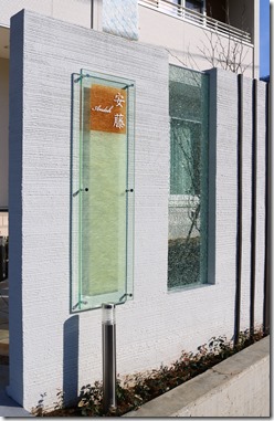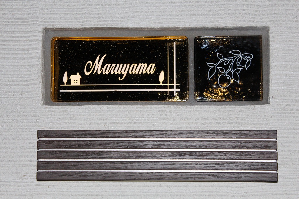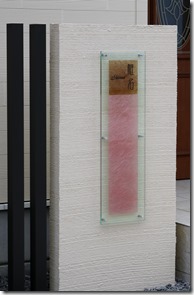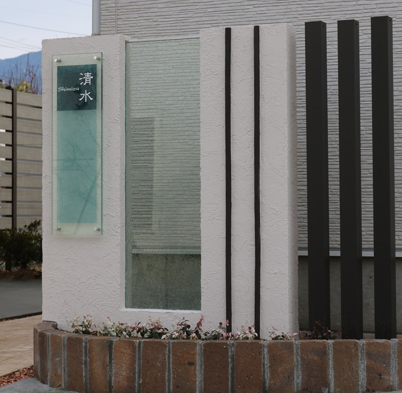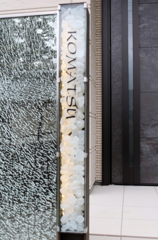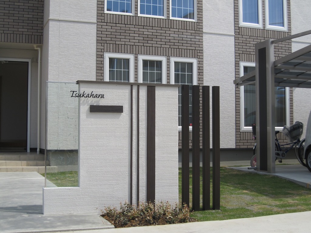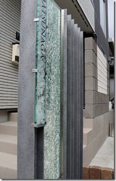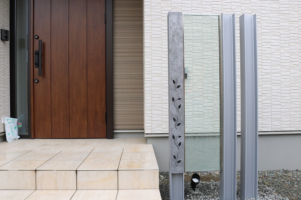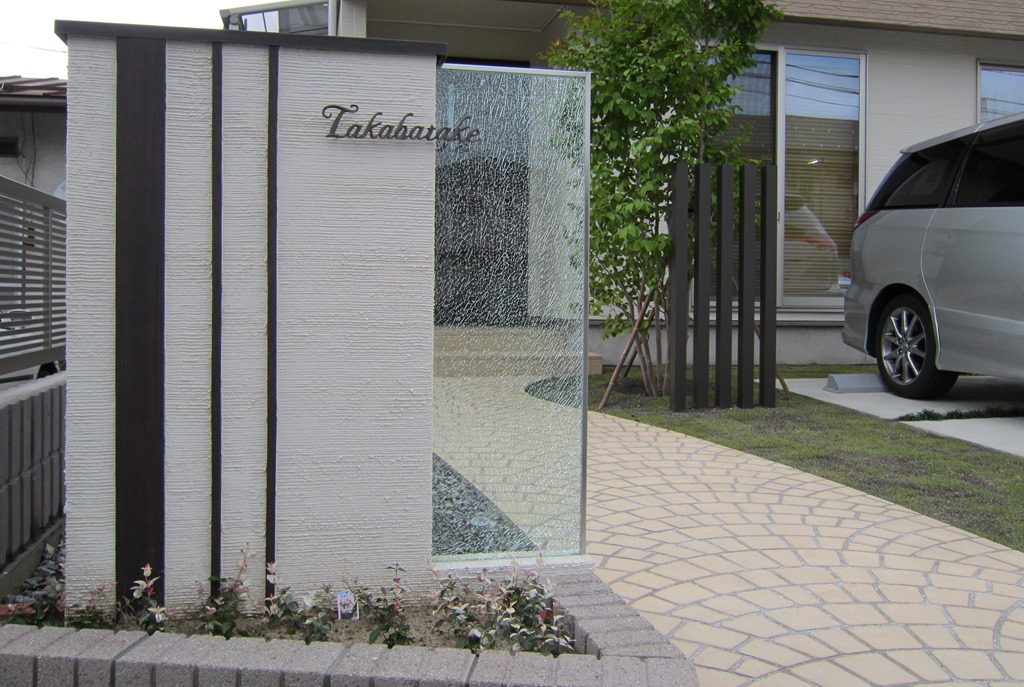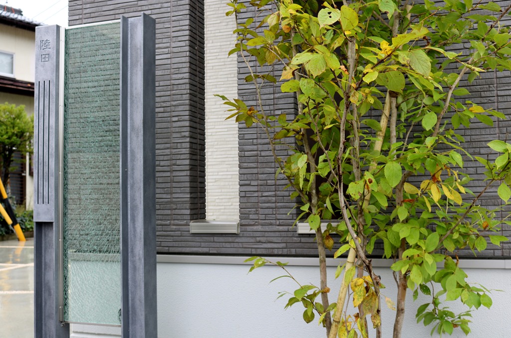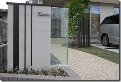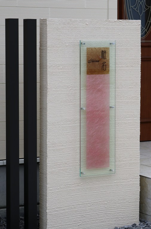 大型ガラスパネルを合わせガラスにして中に手漉き和紙を挟み込み、硝子の表面に名前を彫り込んで作った表札を門柱に取り付ける。サインを主役にしたエクステリア門柱のあたらしいスタイルを考えました。